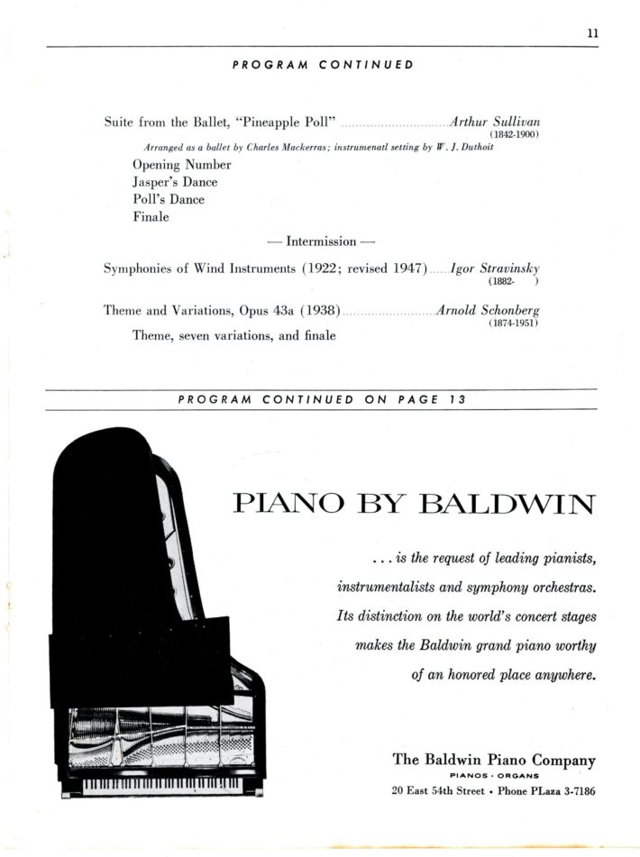 With just one exception, each of the works programmed for Carnegie Hall had previously been recorded by the EWE for Mercury Records.  Further, Fennell himself had written the jacket notes for many of the Mercury albums, thereby providing learned commentary from the conductor’s standpoint.  The concert’s opening work, Ralph Vaughan Williams’ Toccata Marziale (1924), was considered by Fennell to be one of the most significant pieces ever contributed to the winds or band literature, as well as one of the most difficult.[3]  Next up was Gordon Jacob’s William Byrd Suite (1924), consisting of music adapted from the Fitzwilliam Virginal Book, which Fennell considered to be music ideally suited to wind performance, notwithstanding the less favorable opinion that Mr. Salzman would voice in his concert review.  Next came Percy Aldridge Grainger’s Lincolnshire Posy (1905 and 1939), based on folk songs collected by Grainger, and one of Fennell’s own career favorites, which he considered to be Grainger’s best work for winds.  The first half was rounded out with the Suite from the ballet Pineapple Poll by Sir Arthur Sullivan.  Following the intermission, the programming of three contemporary works—Stravinsky’s Symphonies of Wind Instruments (1922; revised 1947); Schoenberg’s Theme and Variations, opus 43a (1938); and, Vincent Persichetti’s Symphony no. 6 (1956)—bore testimony to the Eastman Wind Ensemble’s unswerving commitment to perform new music for winds.  (Indeed, since 1952 Fennell had been busy encouraging living composers to write for the modern wind ensemble.)  The EWE’s 1957 recording of the Schoenberg had, in fact, been the debut recording of the Theme and Variations in its manifestation for winds. (Schoenberg had also written a transcription for orchestra.)  The concert concluded with three marches, acknowledging the vast march repertory—field marches and concert marches alike—that has been an integral component of the band and winds literature