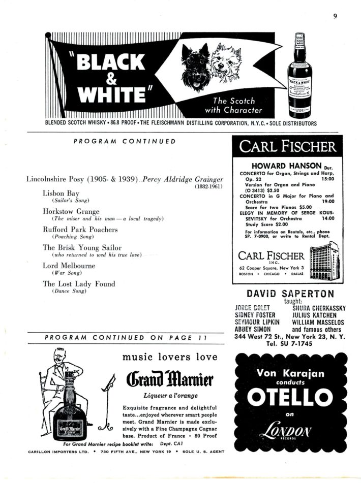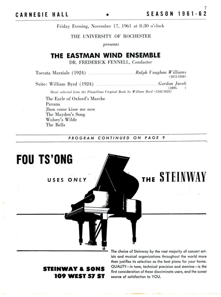 ► Program from the EWE concert at Carnegie Hall, November 17th, 1961. Then as now, a concert program in a professional venue was likely to be chock-full of advertising. Frederick Fennell Collection.