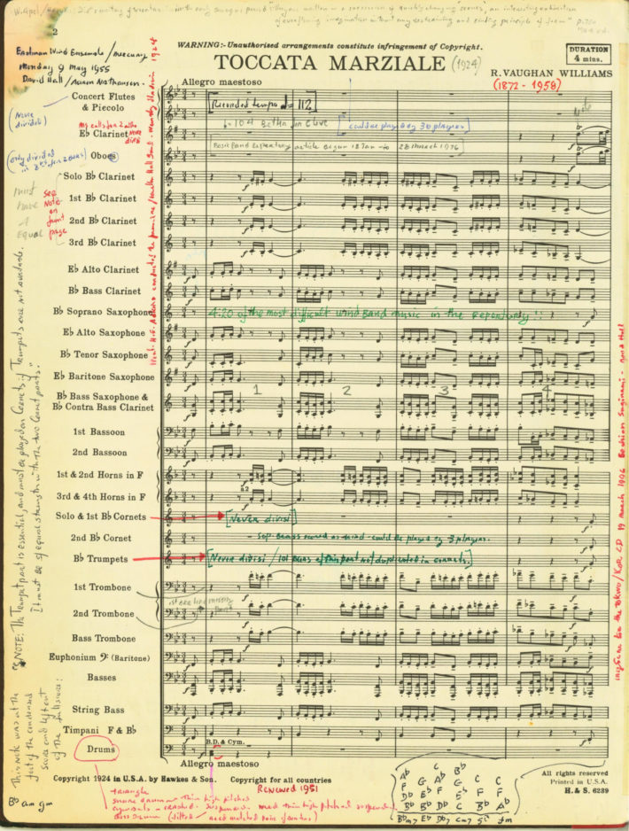 First page of music from FF’s copy of the score of RVW’s Toccata Marziale. Note the acknowledgement of the Eastman Wind Ensemble recording session on 9 May 1955. Frederick Fennell Collection.