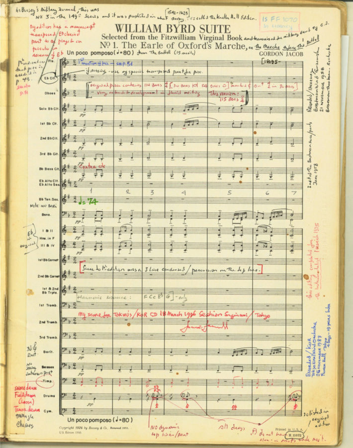 First page of music from FF’s copy of the score of Gordon Jacob’s William Byrd Suite. Note the acknowledgement of the Eastman Wind Ensemble recording session on 21 November 1958. Frederick Fennell Collection.