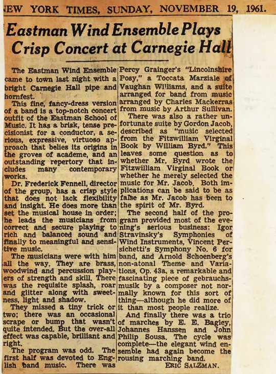 The adjective “crisp” is perhaps the primary take-away from Eric Salzman’s review that appeared in The New York Times on Sunday, November 19th, 1961.  This was no ordinary winds group, this Eastman Wind Ensemble!  With its reputation for finesse and precision—yes, crisp playing!—the EWE had established itself as a winds performance model to be emulated.  This was definitely one for the history books, in two respects.  For the Eastman School of Music, the concert marked the first-ever engagement by an Eastman ensemble in that venue.  For the Eastman Wind Ensemble, the concert represented the culmination of a decade of development and achievement, a fitting milestone. Under Fennell’s direction, the EWE had quickly gathered momentum following the first rehearsal on September 20th, 1952.[1]   In the first two seasons (1952-53 and 1953-54), the regularly scheduled home concerts had been accompanied by twelve concerts for the New York State School Music Association that were broadcast via the Rural Radio Network, as well as two coast-to-coast NBC radio broadcasts.  In addition, there were out-of-town engagements in Chicago for CBDNA (1954), Atlantic City for MENC (1960), and at Vassar College for the College’s centennial (1961).  Besides all of this activity, the EWE had won a smashing contract with Mercury Records that ultimately provided for the release of nearly two dozen recordings between 1953 and 1962, thereby exporting the EWE’s new and innovative sound into the nation’s living rooms in high-fidelity stereophonic sound.  By 1961 the EWE was ready for its New York City debut with a specially chosen program that would showcase several aspects of the ensemble’s mission: paying homage to the English winds and band tradition; celebrating some new and innovative writing for winds based on folk music, and also the heady growing repertory of 20th-century winds music; and finally, acknowledging that most ubiquitous genre without which the winds repertory would not be complete: the march.  Commenting on the program, Frederick Fennell was quoted as saying that it was “. . .designed to encompass the high points in the emergence of the wind band during the second quarter of the 20th century, as a challenging medium of musical expression.”[2]