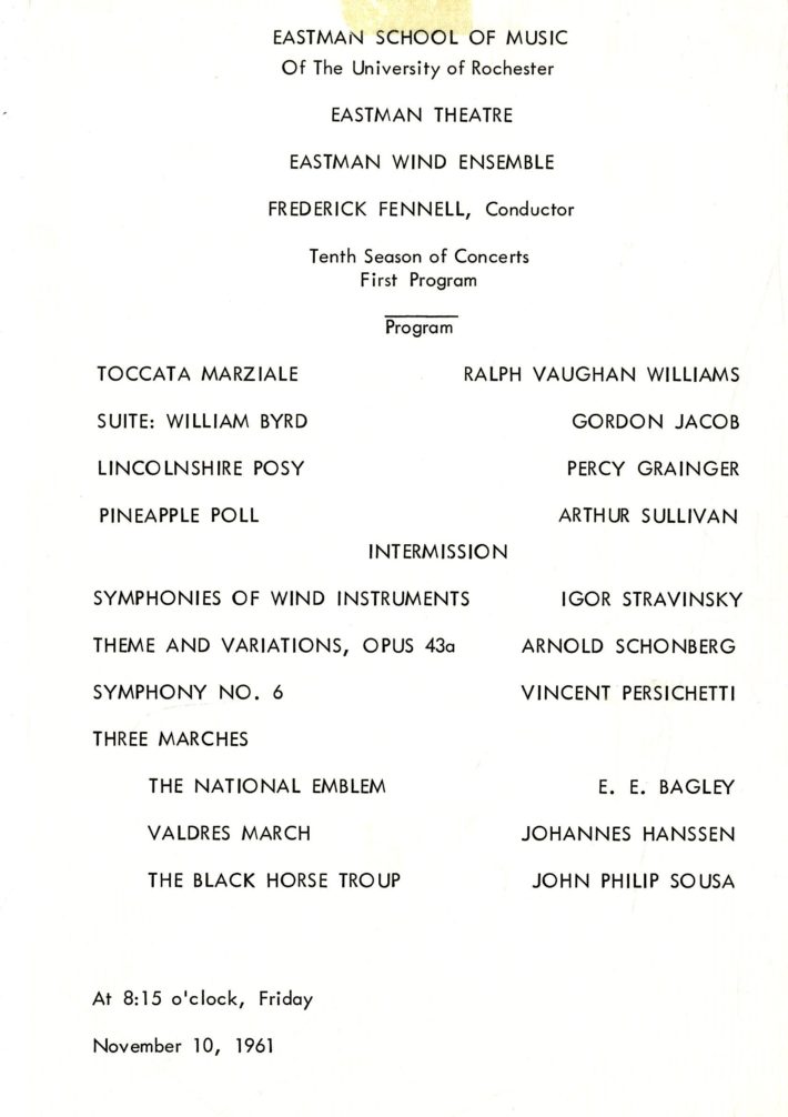 Program from the EWE concert of November 10th, 1961, the first concert of the Eastman School’s 1961-62 academic year. This concert introduced to the local audience the program that the EWE would perform at Carnegie Hall one week later. Eastman School of Music Archives.