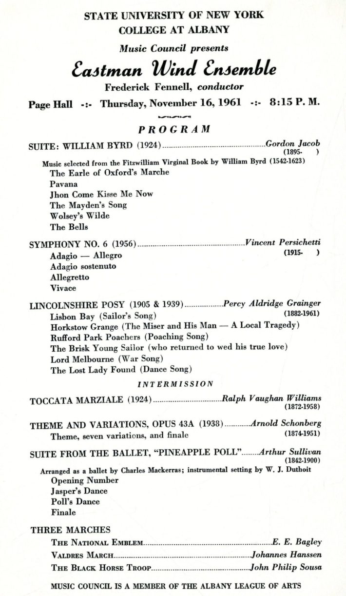 Program from the EWE concert at SUNY-Albany, November 16th, 1961. This concert was the second of two warm-up performances before the Carnegie Hall appearance, albeit ordered in a different sequence than the concert at Carnegie Hall. Frederick Fennell Collection.