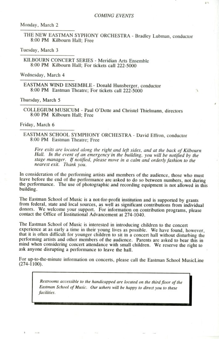 During its seasons of operation, NES performers gave several recitals of chamber music that diversified the orchestra’s offerings. There were also collaborations with faculty members; violinist Oleh Krysa appeared with the NES in Beethoven’s Violin Concerto, and Mr. Krysa and violoncellist Stephen Doane together appeared with the NES in Brahms’ Double Concerto in A minor. Moreover, this was an orchestra that, founded in the closing years of the 20th century, was clearly at home with 20th-century repertory, performing such works as Lukas Foss’ Renaissance Concerto, Stravinsky’s Symphonies of Wind Instruments and The Rite of Spring and The Firebird; Paul Hindemith’s Mathis der Maler; Shostakovich’s Ninth Symphony; Ravel’s Piano Concerto in G major; Gershwin’s An American in Paris; Bartok’s Concerto for Orchestra; John Adams’ “The Chairman Dances” from the opera Nixon in China; and in a concert on November 22nd, 1998, Gustav Mahler’s complex and challenging Seventh Symphony, marking the Eastman School premiere of that work. An emphasis on publicity and community connection was clearly on the orchestra’s agenda, for an invitation to join the orchestra’s mailing list was included in each concert program.