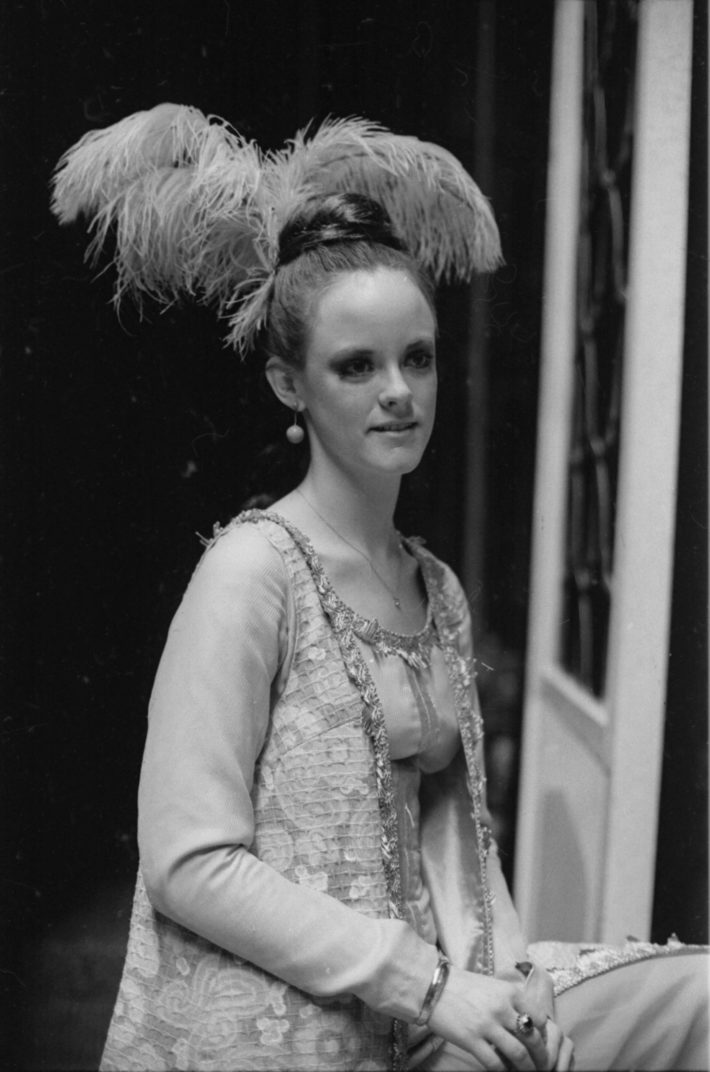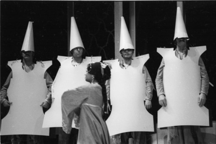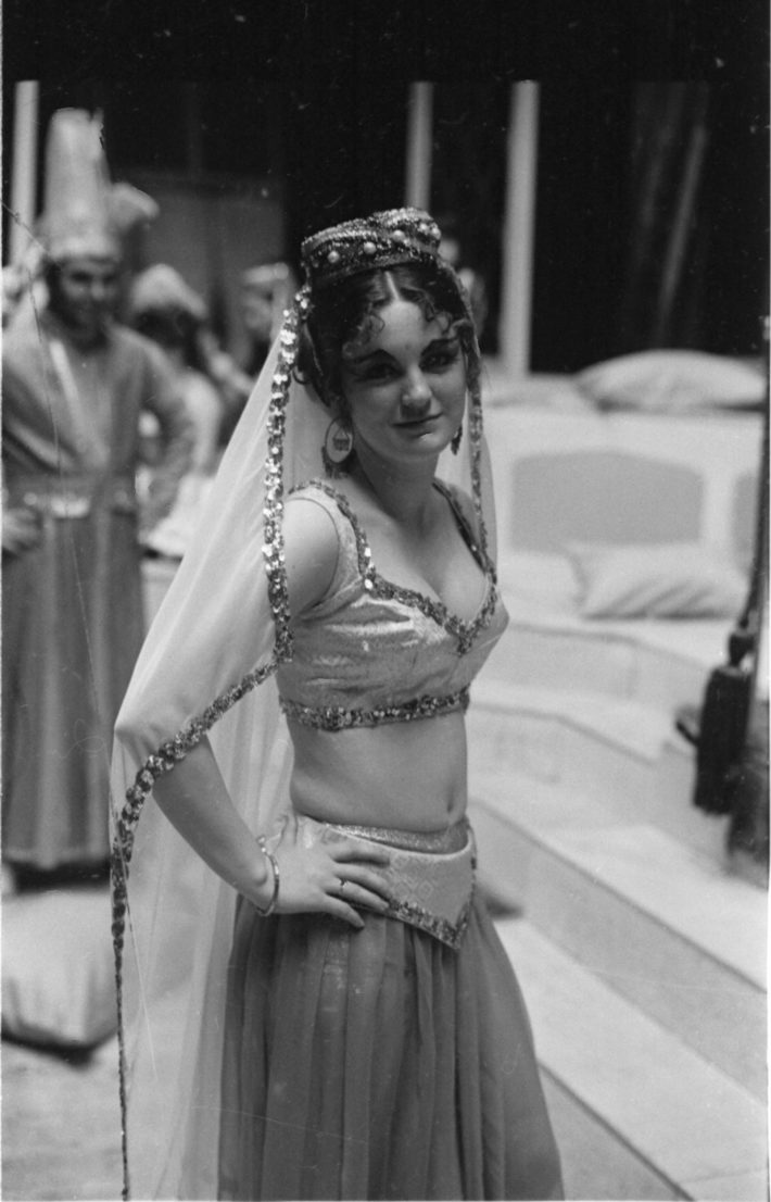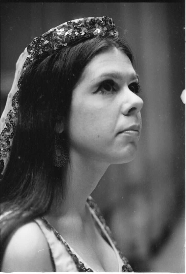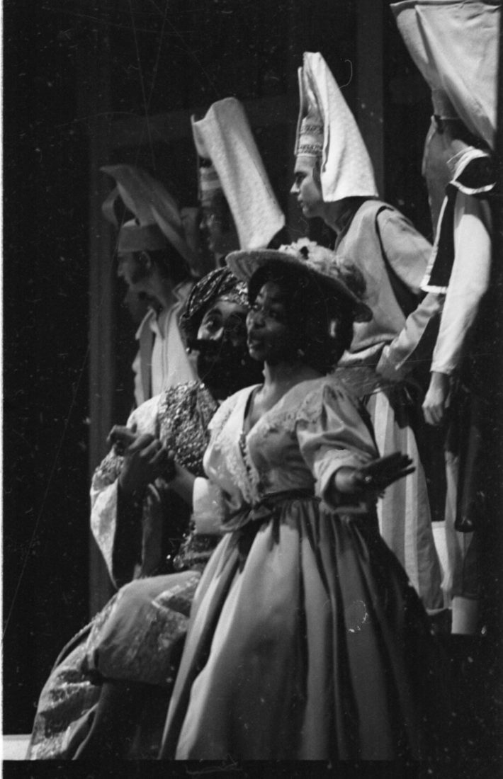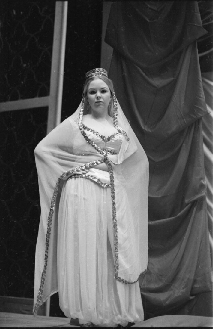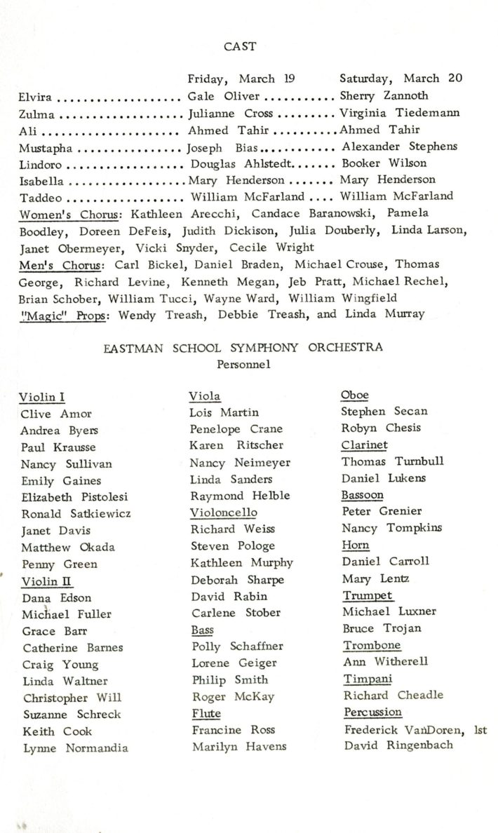 Set in the 18th century, the action of L’Italiana in Algeri surrounds that most timeless of themes, the pursuit of love (in whichever form: physical, romantic, erotic, you name it). The Bey of Algiers (think of him as the Sultan, or chief administrator) is bored with his harem, and conceives a notion to marry off his principal wife Elvira to his slave Lindoro, after which he will take to himself one of those beautiful Italian girls about whom he’s heard so much. Long story short, the lovely Isabella, the Italian girl of the title, is spotted and is presented to Mustafa, but in a hilarious sequence of events, she outwits him. The opera ends happily for everyone, or almost. Isabella and her beloved Lindoro escape on a ship bound for Europe, and Mustafa seems destined to remain with his faithful wife Elvira. In both of the March, 1971 performances, the role of Isabella was sung by Mary Henderson, BM ’70, MM ’72. Ms. Henderson (today Mary Stucky) went on to an operatic career in Europe, also performing in recital and oratorio in Europe and in the USA; she taught at Washington University in St. Louis and later at the College-Conservatory of Music (University of Cincinnati), eventually retiring as Professor Emerita of Voice. The other leading roles were played by the following: