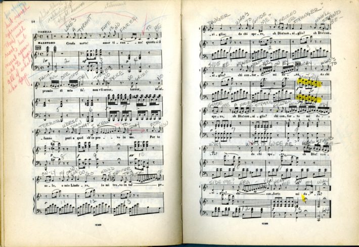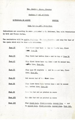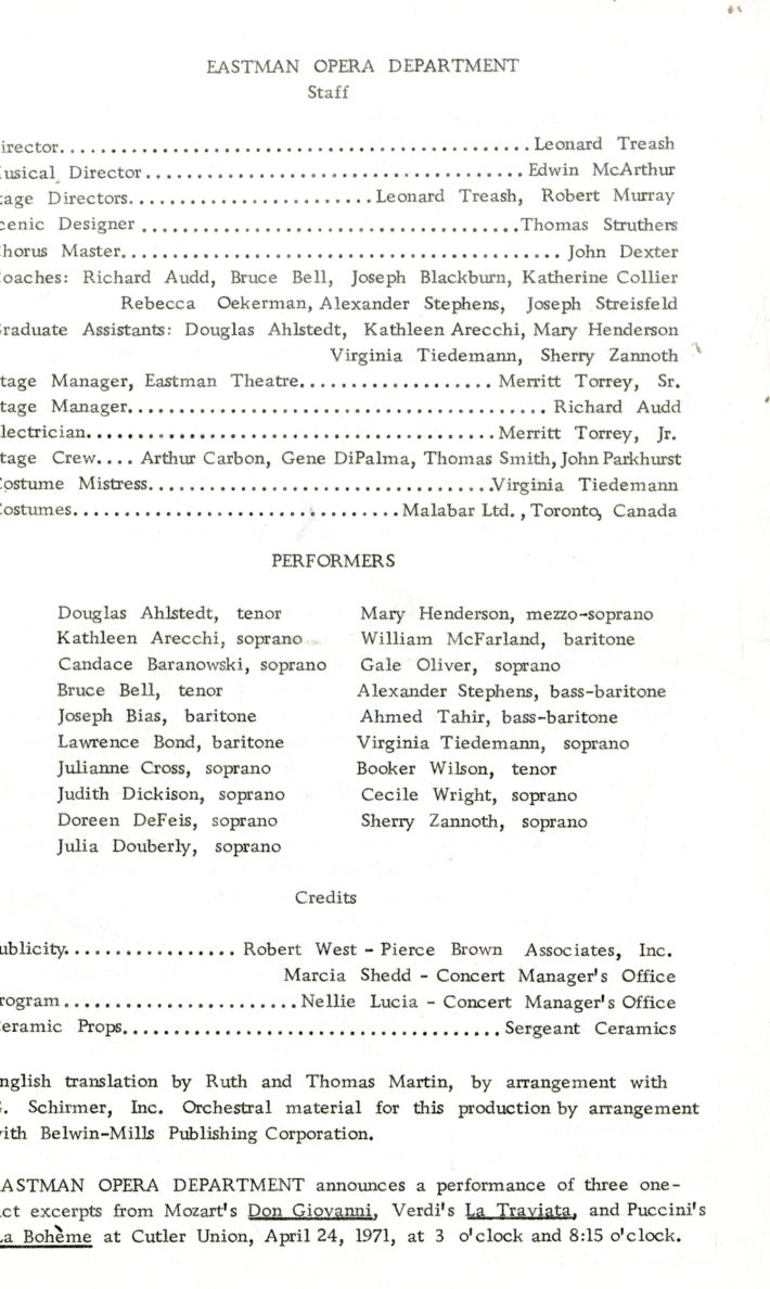 Master tapes of both of the Eastman performances are extant in the Eastman Audio Archive; each cast recording clocks in at just over two hours and two minutes. Photographer Louis Ouzer was present on March 19th, 1971 at what appears to have been the dress rehearsal, and snapped a copious number of shots of the performers in action and in repose. In addition, director Treash’s two vocal scores (Ricordi and G. Schirmer) and various notes and production papers are preserved in the Leonard Treash Collection at the Sibley Music Library.