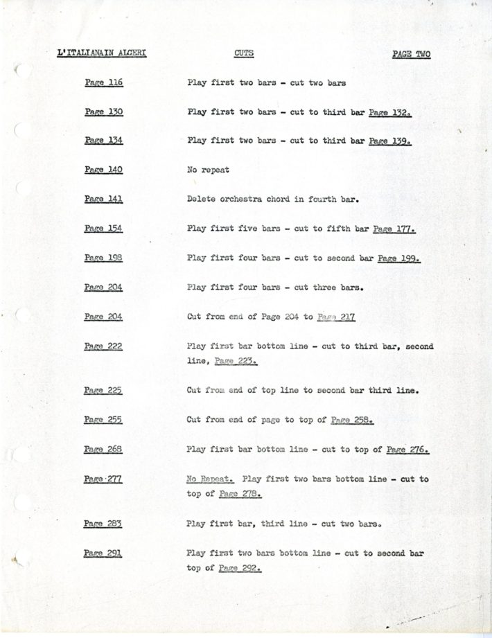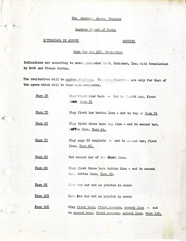►Memorandum detailing cuts to be made in the score. Leonard Treash Collection.