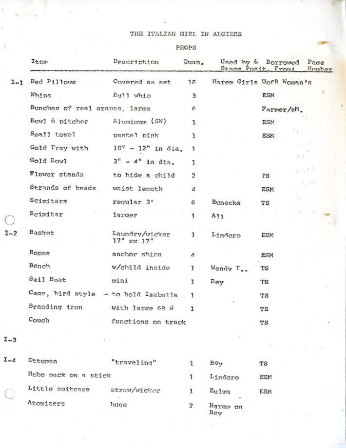 ►Props list for the March, 1971 production. Leonard Treash Collection.