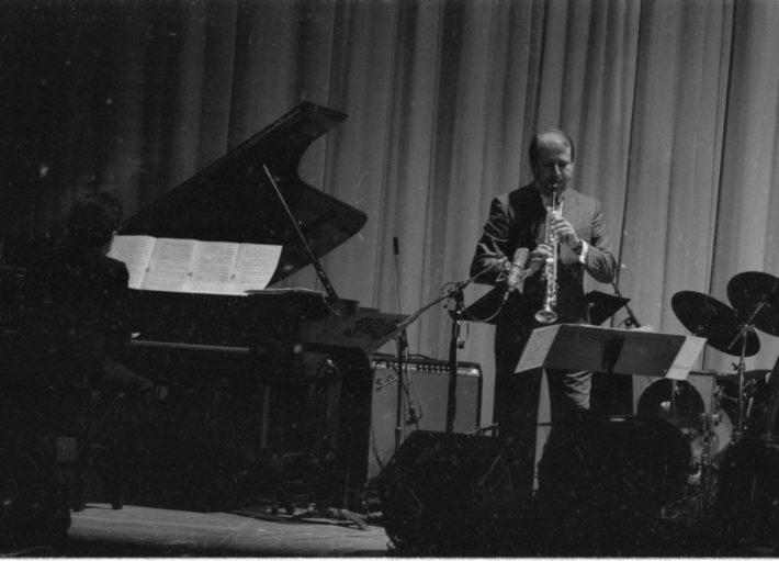The performers who gathered for this occasion represented a kind of who’s who of Eastman jazz across three decades—colleagues who had worked with him in the ‘60s, and alumni of the ‘70s and ‘80s who had studied with him, in addition to JCM faculty members. The names of performers are given in the printed program, displayed here. Photographer Louis Ouzer was present not only for the concert, but also for a rehearsal session in Room 120, the same room that today bears Professor Wright’s name as the Ray Wright Room. Mr. Ouzer’s photographs capture something of the spirit that informed the work of these artists, who had gathered at short notice to pay tribute to their colleague, their mentor, their friend.