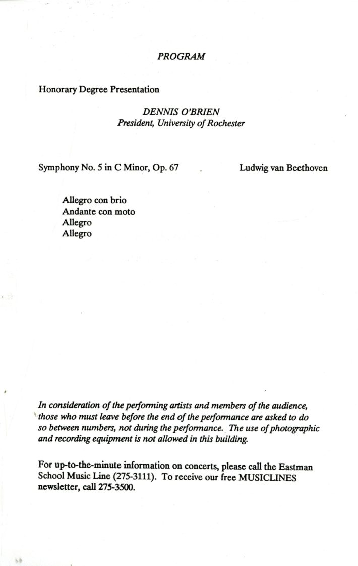 Thirty-six years ago this week, on the afternoon of Tuesday, April 7th, 1987, the Eastman Philharmonia performed under the direction of renowned conductor Sir Georg Solti. Maestro Solti’s guest appearance was confined to that one day; he arrived in Rochester by air in the early afternoon and, after stopping for a quick lunch, met the Philharmonia at 2 PM for a two-hour rehearsal in the Eastman Theater. The rehearsal was followed by a break, after which the concert commenced at 5 PM, featuring one single work, Beethoven’s Symphony no. 5 in C minor. The Beethoven was preceded by the conferral of an honorary degree, with University President Dennis O’Brien presiding.[1]