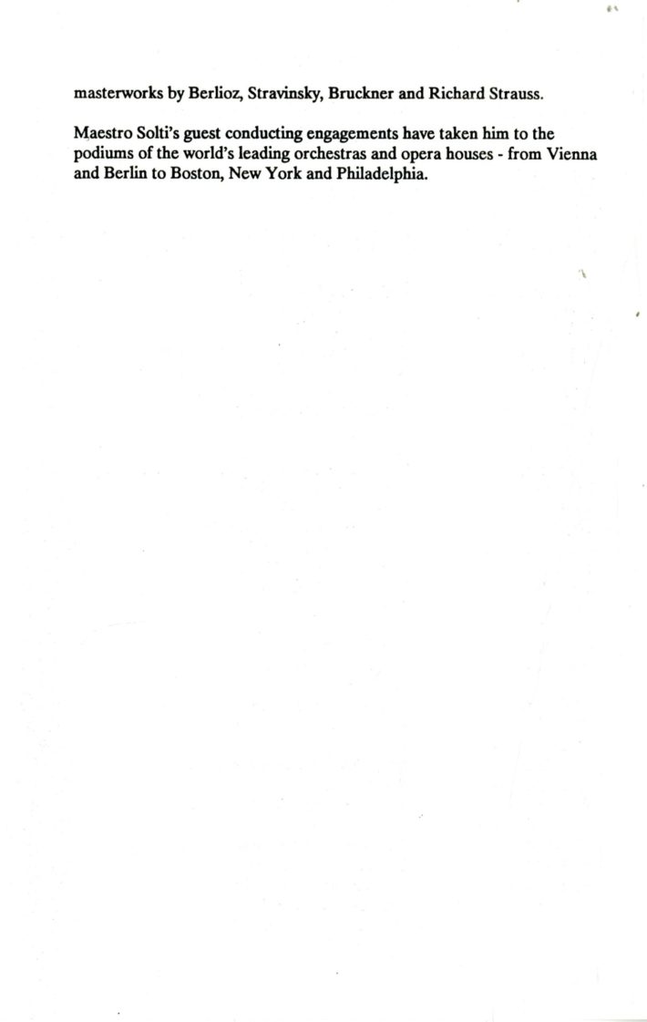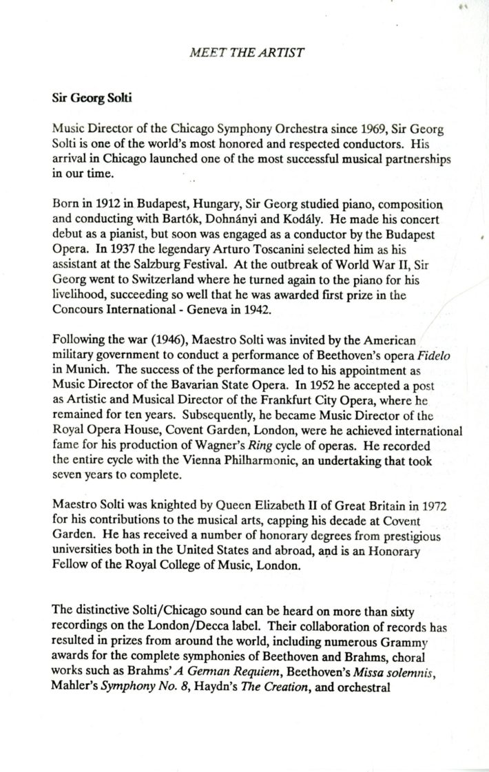 The April, 1987 collaboration with Maestro Solti marked the Eastman Philharmonia’s second opportunity in the 1986-87 academic year to work with a distinguished guest artist. In the previous November, the orchestra had made a tour of West Germany with renowned concert pianist Shura Cherkassky (1909-1995) joining the orchestra as featured guest soloist. On tour the orchestra gave concerts in the cities of Nürnberg, Friedrichschafen, Mannheim, Leverkusen, Witten, Viersen, and Stuttgart.[3]