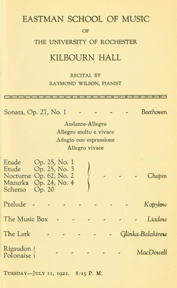While not inherently associated with the summer session, a particular Eastman School milestone occurred in the summer of 1922: the installation and launch of a radio transmitting service at the Eastman School. Earlier that spring, the Rochester press had reported that the two daily newspapers—the Democrat & Chronicle and the Times-Union—would jointly make a gift of a radio transmitter and associated operating equipment to the Eastman School, which would then own outright and maintain the equipment. The proposal had met with the approval of both UR President Dr. Rush Rhees and Mr. George Eastman. The plan was for the broadcast of concerts from Kilbourn Hall and, later on, from the soon-to-be completed Eastman Theater, as well as other, extra-musical programming that would include government, weather, and market reports, and also baseball scores (it’s the national game, after all!).[9] The transmitting tower, made of steel and fully 52 feet tall, was erected on the roof of the Eastman School, where it was clearly visible from East Avenue. The connected equipment was on the school’s fifth floor in a room directly below the tower. A photo of the tower was published in the Rochester press, and a similar photo is displayed here. The requisite license to operate a radio station was granted by the office of the U.S. Secretary of Commerce[10] on July 6th, 1922, and the call letters WHAM were assigned to the Eastman School’s service. On that same day the antenna was installed, with the further work of tuning and adjustments carried out more or less around the clock through the ensuing weekend. On the afternoon of Monday, July 10th, the Western Electric Co. engineer who had overseen the installation tested the set, and several telephone calls were received at the Eastman School confirming that the signal was being picked up by radio sets around town. Significantly, one listener telephoned the school from as far afield as Watertown, New York, indicating that the signal had gone further afield than merely the local vicinity.[11] The first event to be broadcast from Eastman was a piano recital by faculty member (and summer session faculty member!) Raymond Wilson on Tuesday, July 12th. Mr. Wilson’s program was duly published in the Rochester press for the benefit of those members of the public who owned radio sets and would be able to tune in.