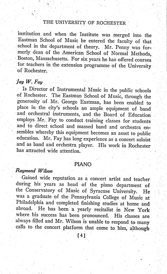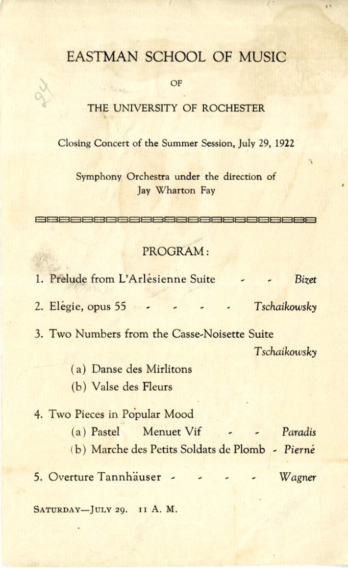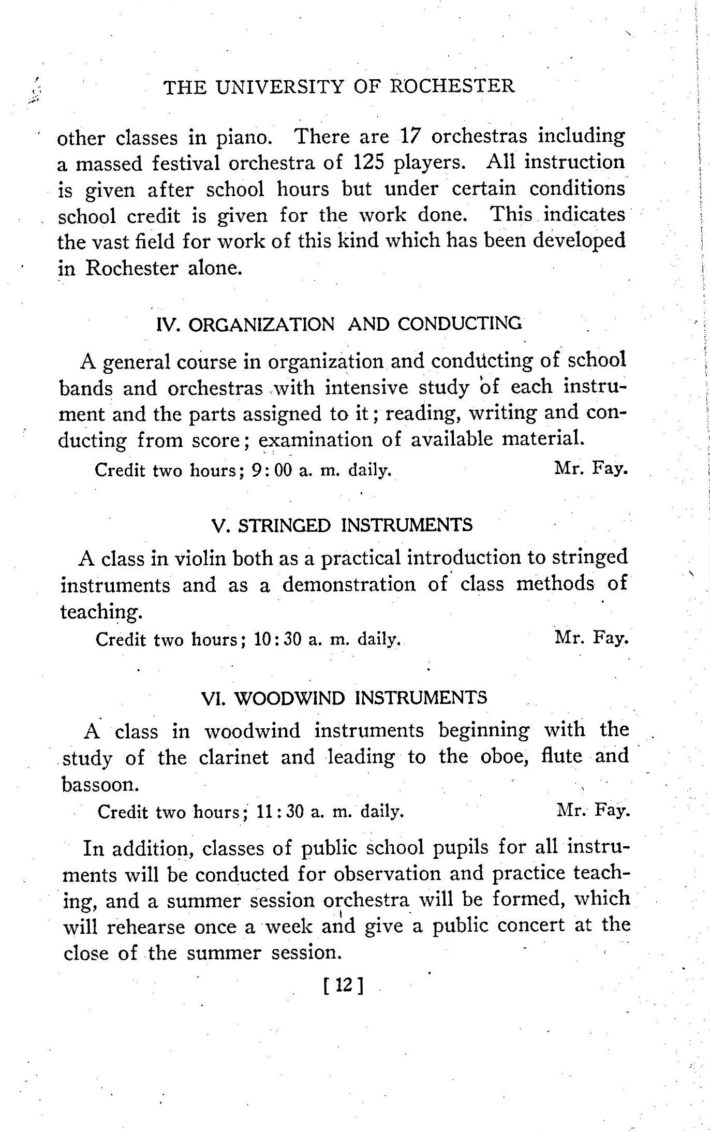 One noteworthy aspect of the 1922 summer session was that the six courses promoted in the curriculum were designed for those who were already teaching, rather than for the enrolled collegiate-level students. Mr. Jay Wharton Fay, supervisor of instrumental music in the Rochester public schools, had been engaged to teach three courses in public school instrumental music (organization and conducting; stringed instruments; and, woodwind instruments). Alongside his work in the Rochester public schools, Mr. Fay taught in three summer sessions at Eastman (1922, 1923, 1924), and he was active at the national level as Chairman of the Instrumental Committee of the Music Supervisors’ National Conference. In the latter capacity he wrote several features for the Music Supervisors’ Journal (today the Music Educators Journal). In the 1922 summer session, Mr. Fay used classes of school music pupils for demonstration purposes in the classroom, and he also organized those pupils into a symphony orchestra for regular rehearsals and ultimately to give a concert at the end of the session.[5]