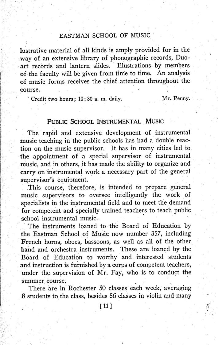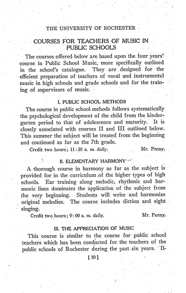 Besides Mr. Fay’s courses, there would be three courses for teachers of music in public schools (public school methods; elementary harmony; and, the appreciation of music) taught by Mr. George Barlow Penny. Mr. Penny (1861-1934) belonged to that number of Eastman School faculty members who had been instructors in the D.K.G. Institute of Musical Art before 1921. A native of Kansas, Mr. Penny’s career reflected a propensity not only for pedagogy, but for academic administration. Shortly after graduating from Cornell he had been invited to the University of Kansas where was a chief organizer and then the dean of the School of Fine Arts, in which he also taught composition, organ, and voice; he was later an organizer and the dean of the School of Fine Arts at Washburn College (Topeka, Kansas). Arriving in Rochester, New York, he served as Director of the Rochester Conservatory of Music (1910-15) which eventually was consolidated with the D.K.G. Institute of Musical Art. Besides his primary focus on music, Mr. Penny had been a lecturer on architecture, sculpture, and painting. By the time he began his Eastman School service, Mr. Penny had been listed in Who’s Who in America. Until the end of his life he was a faculty member in theory, composition, and history, and also taught music appreciation.