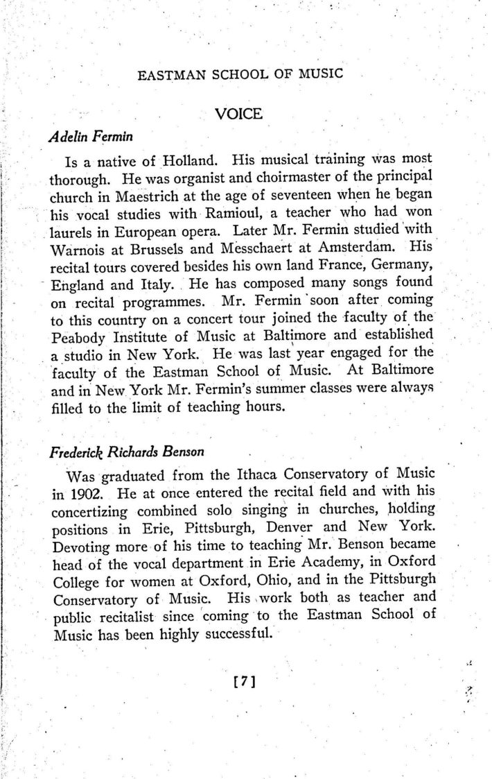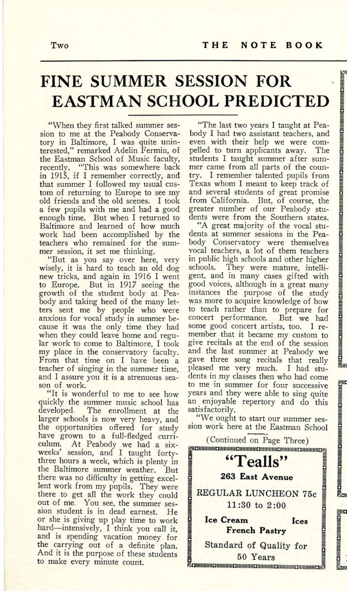 This feature in the student newspaper The Note Book quoted at length one of the 1922 summer faculty members, Adelin Fermin (1867-1941), commenting on the summer session and its value. Mr. Fermin served on the Eastman faculty from 1921 until his retirement in 1935.