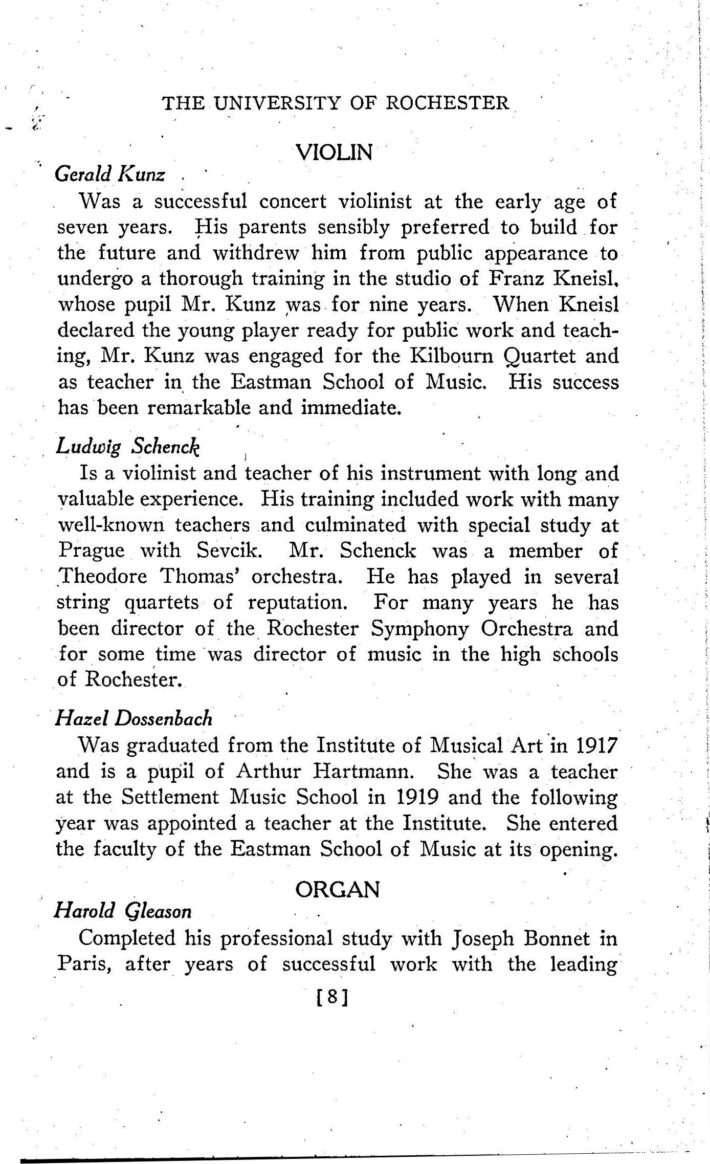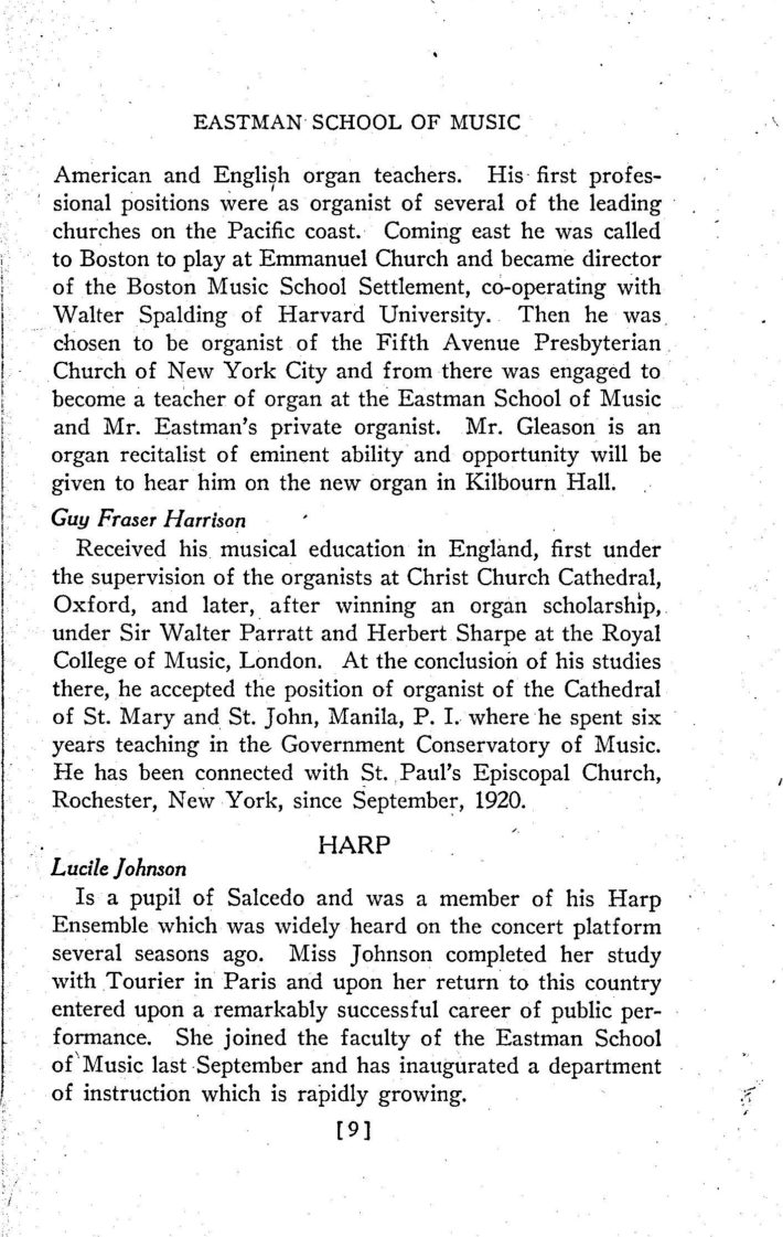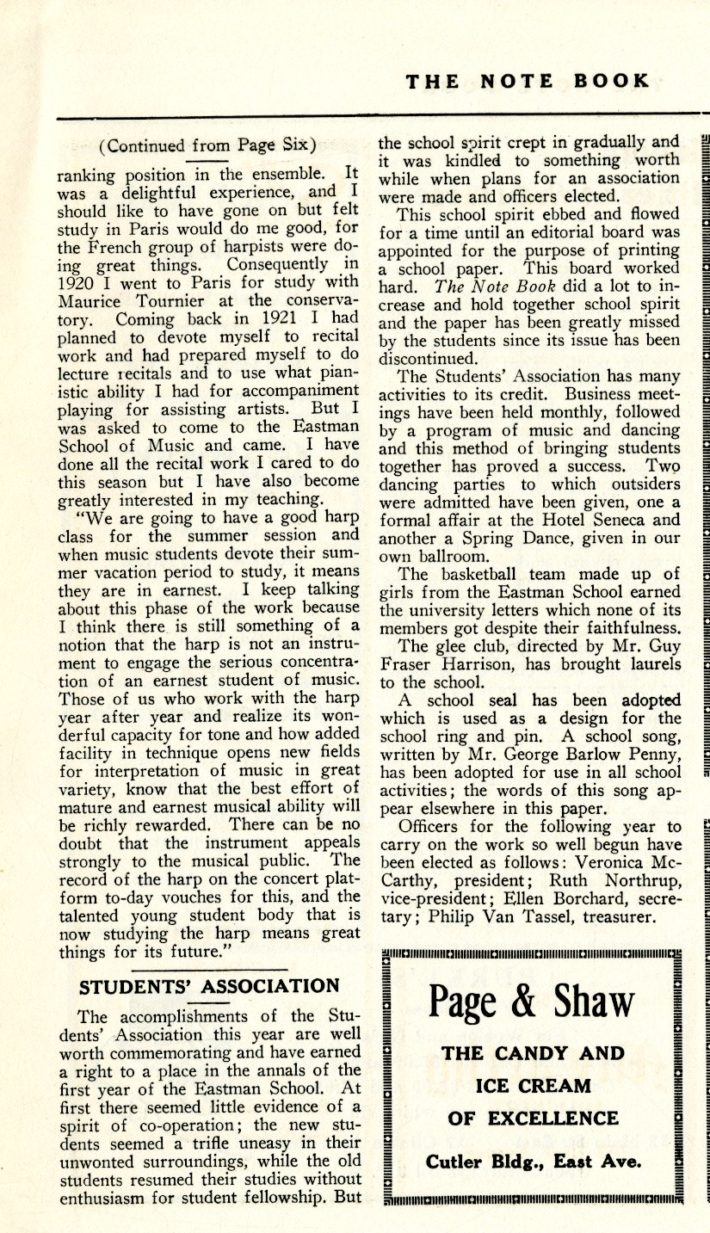 Lucile Johnson (1898-1992), first instructor of harp at the Eastman School and one of the 1922 summer faculty members, was quoted in this feature in the student newspaper The Note Book. Ms. Johnson (later Mrs. Lucile Johnson Rosenbloom) served on the Eastman faculty from 1921 until 1936 and was later appointed principal harpist of the Pittsburgh Symphony Orchestra.