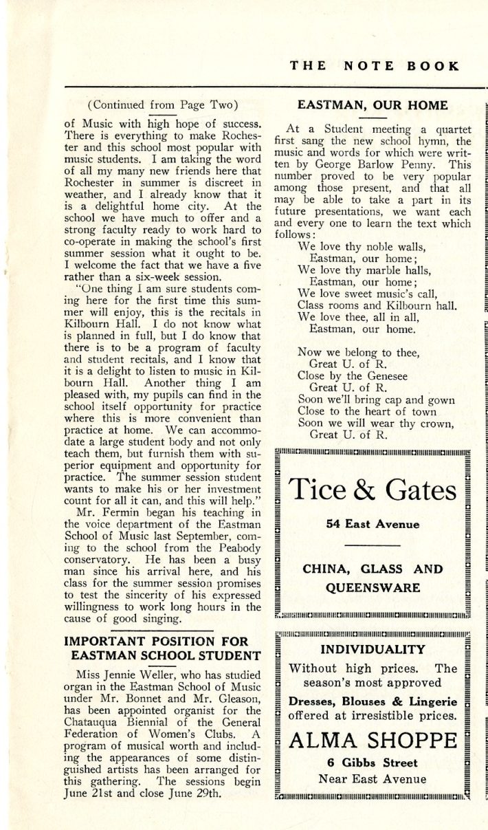 [2] “Fine summer session for Eastman School predicted” in The Note Book, volume I, no. 19 (June 15, 1922), pages 2 and 3.