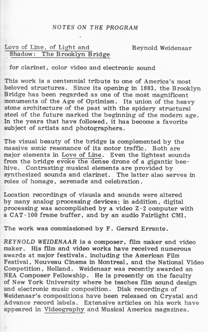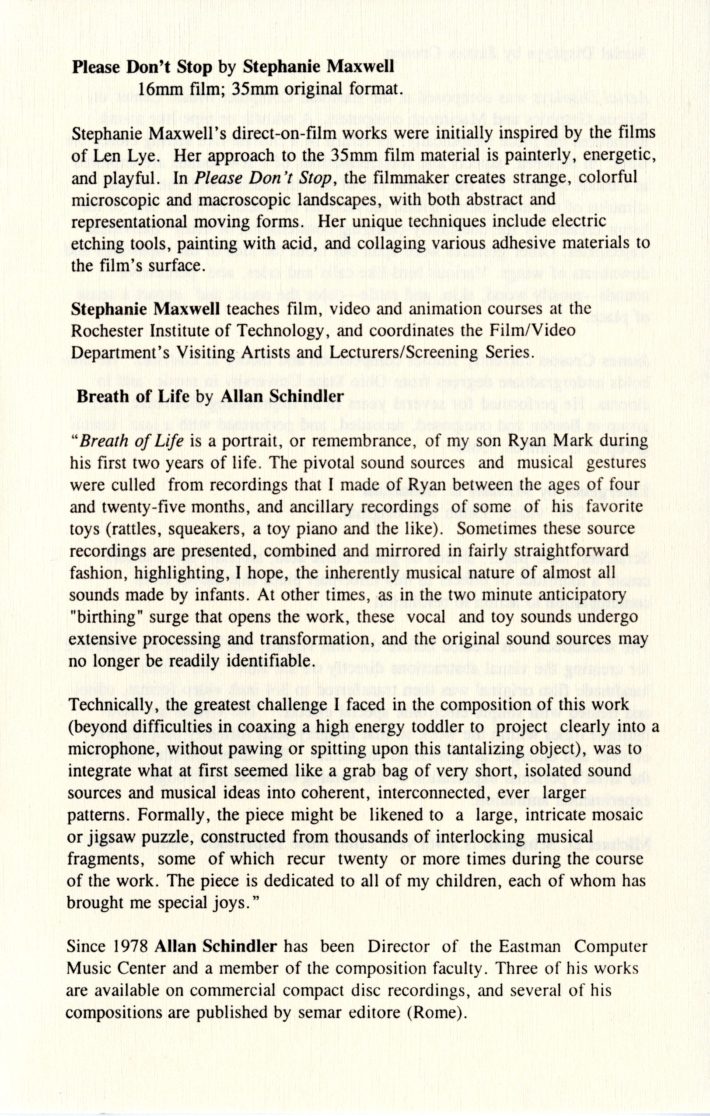 Further, Schindler’s work with ImageMovementSound—and, particularly, his professional collaborations with filmmaker Stephanie Maxwell—expanded his compositional oeuvre into a new multimedia genre that the composer termed “collaborative image/music composition” or (more simply) “film/music composition.” In these experimental, multimedia works, Schindler explained, “structural design, textural patterns, and expressive gestures and nuances unfold simultaneously, but not always synchronously, in aural and visual form,” the music and images contributing “equally to an aggregate, multi-threaded structural and expressive design.”[8]