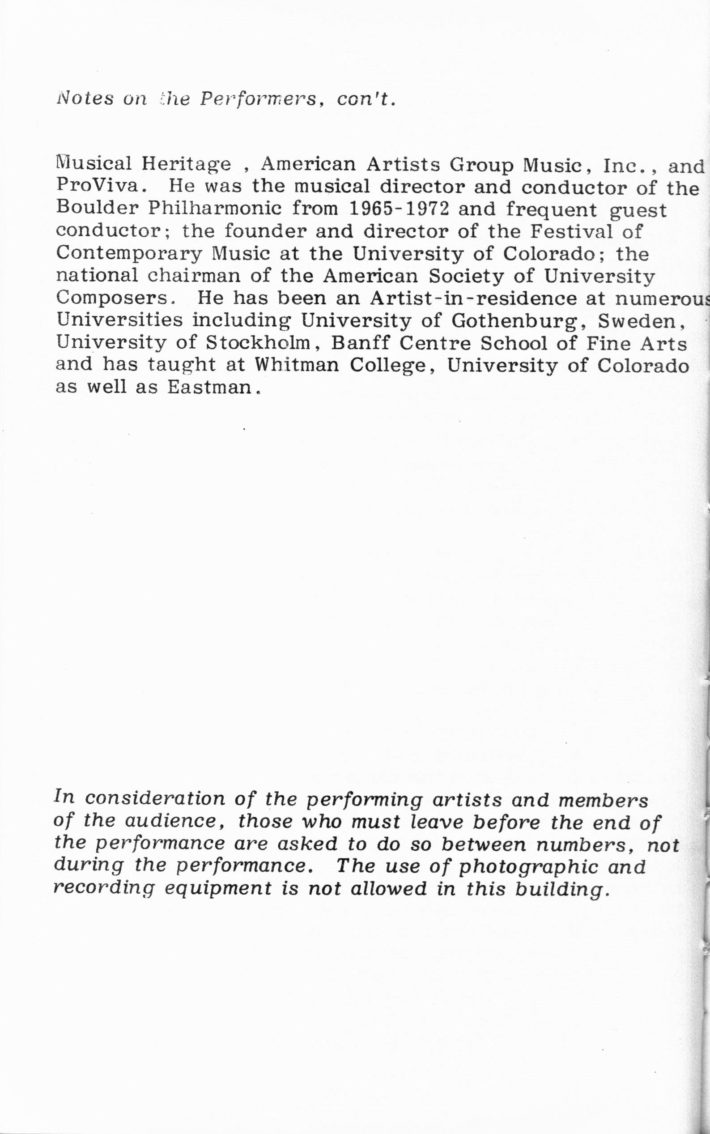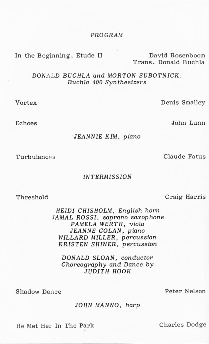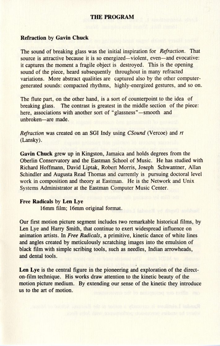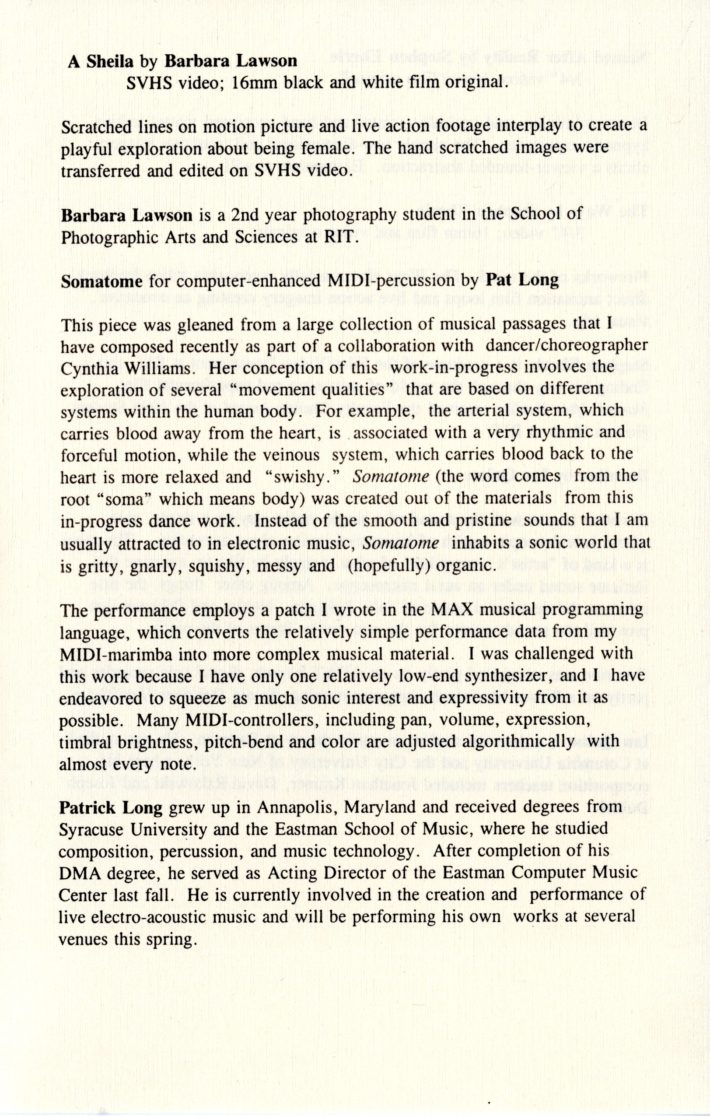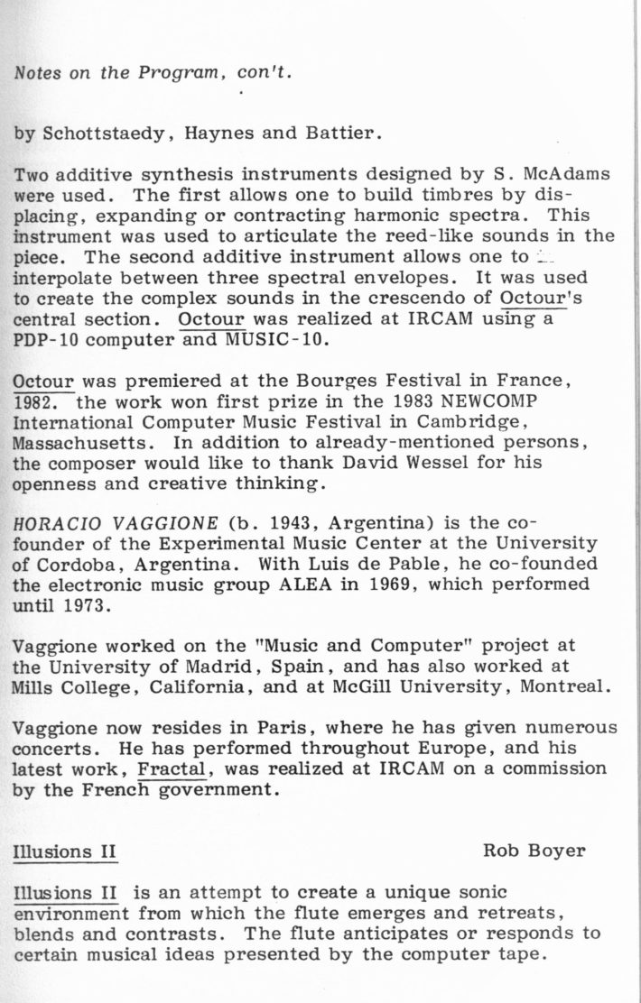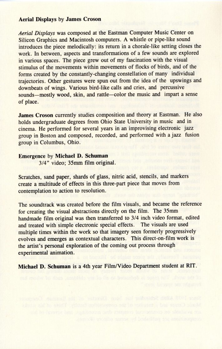 For the four concerts held during the 1983 ICMC, Schindler, with the other members of the conference selection committee, programmed 28 diverse works representing the most exciting developments in electronic and computer music composition. As quoted in an article on the conference for the New York Times, Schindler noted that among the music selected for the conference, the committee emphasized in particular works that incorporate live performers alongside taped computer sounds: “We worked very hard to make the concerts as varied and appealing as possible. We’re not just interested in far-out noises; we want the computer to make music.” Robert V. Palmer, music critic for Rochester’s Democrat and Chronicle, lauded the choice, remarking that several such works were particularly compelling—among them Carla Scaletti’s Lysogeny, Jean-Claude Risset’s Mirage, and Morton Subotnik’s Ascent Into Air. The concerts also included pieces for tape alone and works with live choreography or other visual elements, such as Moire by Reed Holmes, with choreography by Pamela Tokanski that was performed by the Black Crow Flying Dance Theatre.