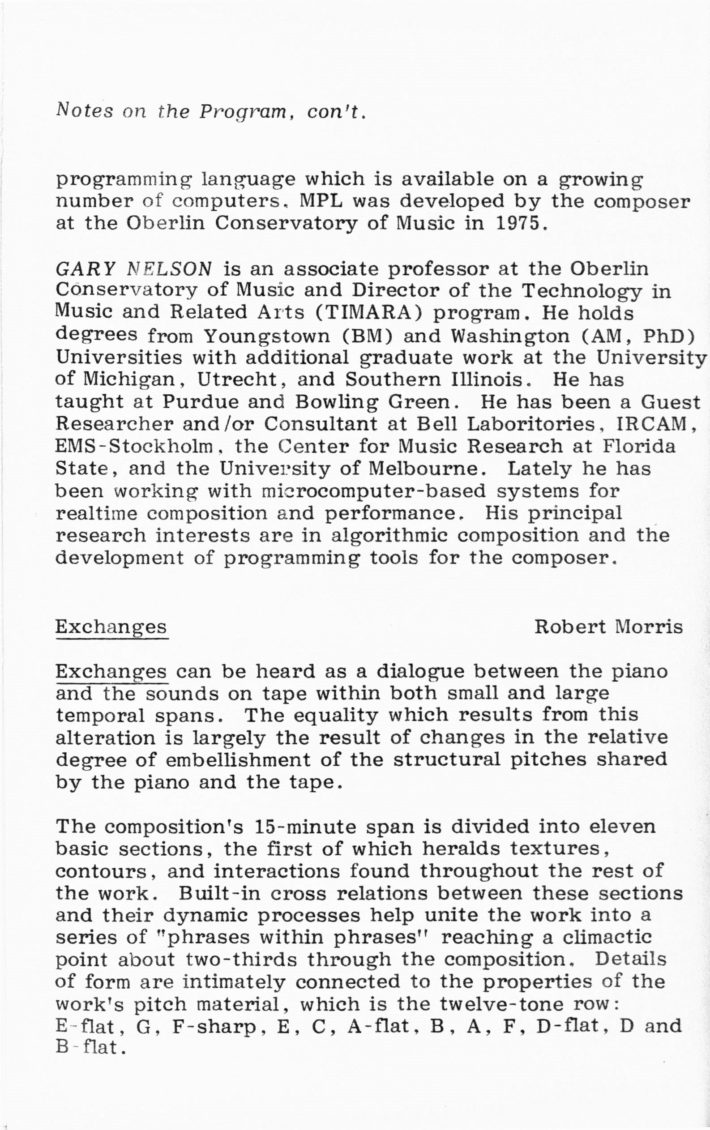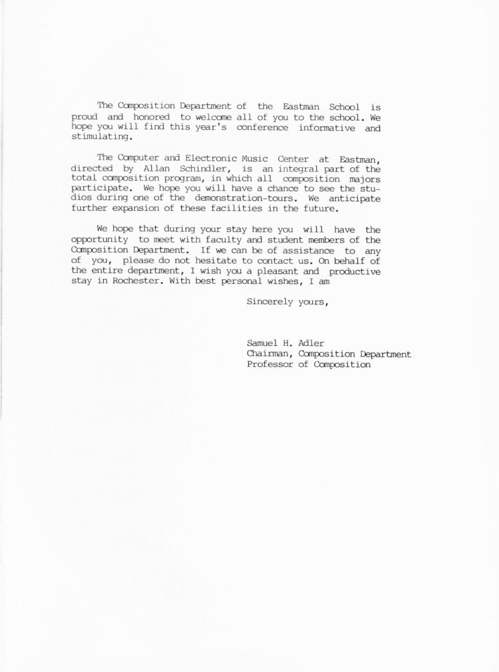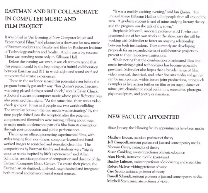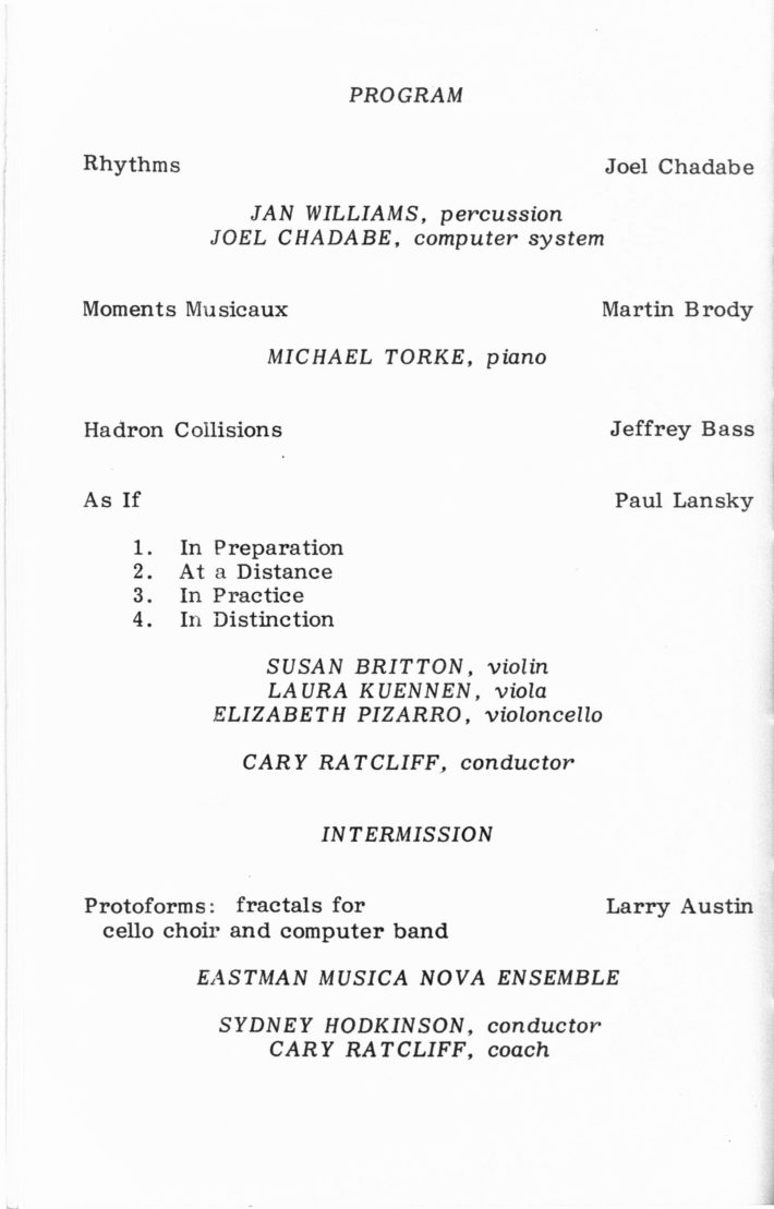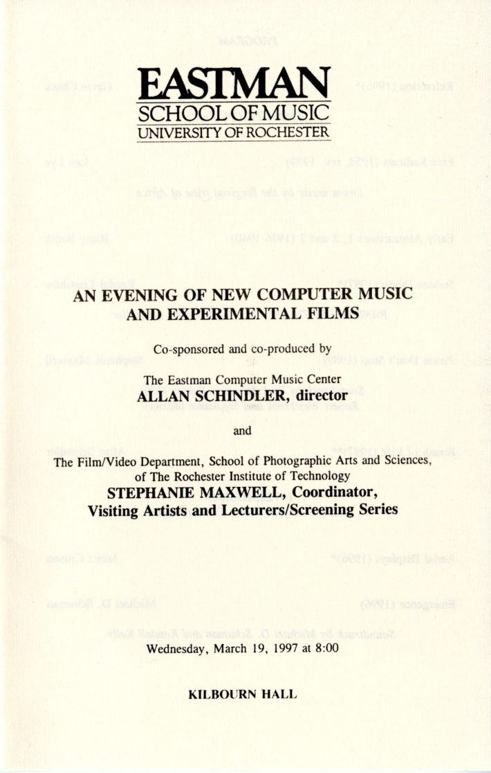 [5] Allan Schindler, “A (not so brief) History of the Eastman Computer Music Center,” in Eastman Computer Music Center: 25th Anniversary Concert Series (Rochester, NY: Eastman School of Music, 2007).