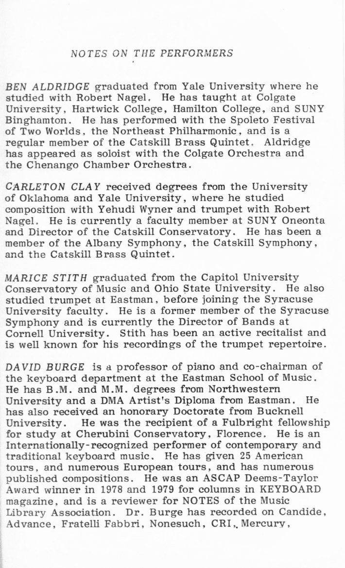 One especially successful approach—which Schindler applied in many of his own composition projects as did many other ECMC composers—was collaboration between composers and performers. This included numerous works that were commissioned by or written expressly for Eastman faculty performers. In the 1980s, Schindler produced three such pieces: Tremor of Night and Day (1984), which was commissioned and premiered by Robert Sylvester (Professor of Cello at ESM from 1975–1986); Eternal Winter (1986), written for and premiered by John Marcellus (Professor of Trombone at ESM from 1978–2014); and At the Edge (1989), commissioned by John Beck (Professor of Percussion at Eastman from 1959–2008).