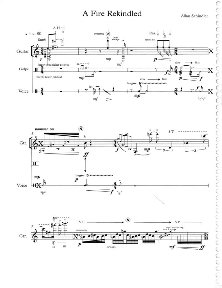 Schindler remained active as a composer after his 2015 retirement from Eastman, with his last completed work, a solo for classical guitar commissioned and premiered by Dieter Hennings at a pair of concerts by the Eastman BroadBand ensemble at Eastman’s Hatch Recital Hall and Ithaca College’s Ford Hall. Titled A Fire Rekindled (2015), the piece has, in the composer’s words, “a spontaneous, improvisatory, direct, and game-like quality” that makes the work “exhilarating” for performers and listeners, both. Like Schindler’s other works, A Fire Rekindled is constructed from “a collection of interlocking, mostly fragmentary and open-ended melodic, harmonic, rhythmic, and textural ideas” that, following his typical compositional approach to such “defining sounds,” Schindler combined thoughtfully in various orderings and juxtapositions with his typical deep musicality.[10]