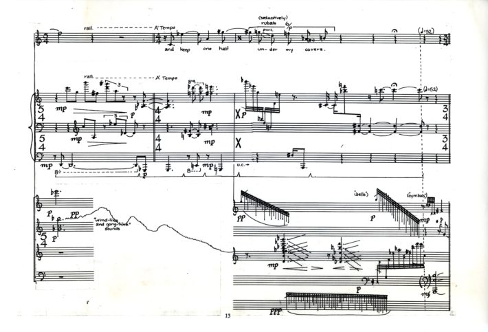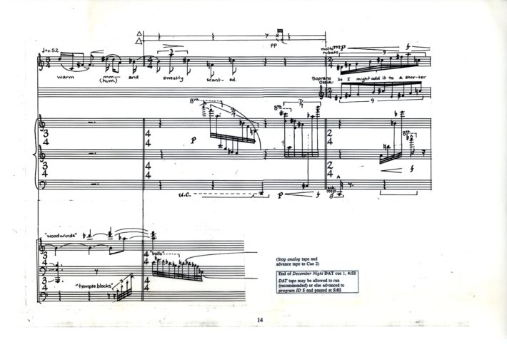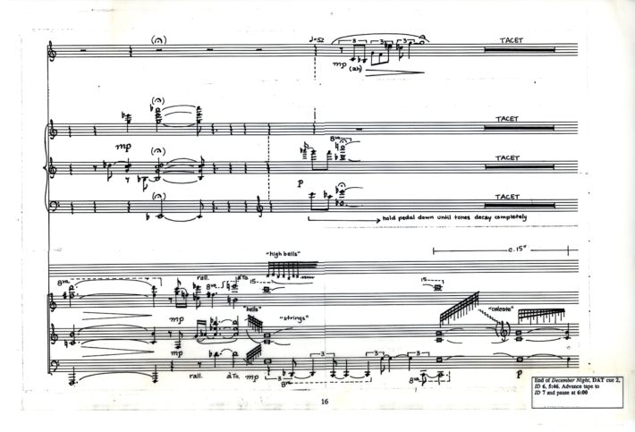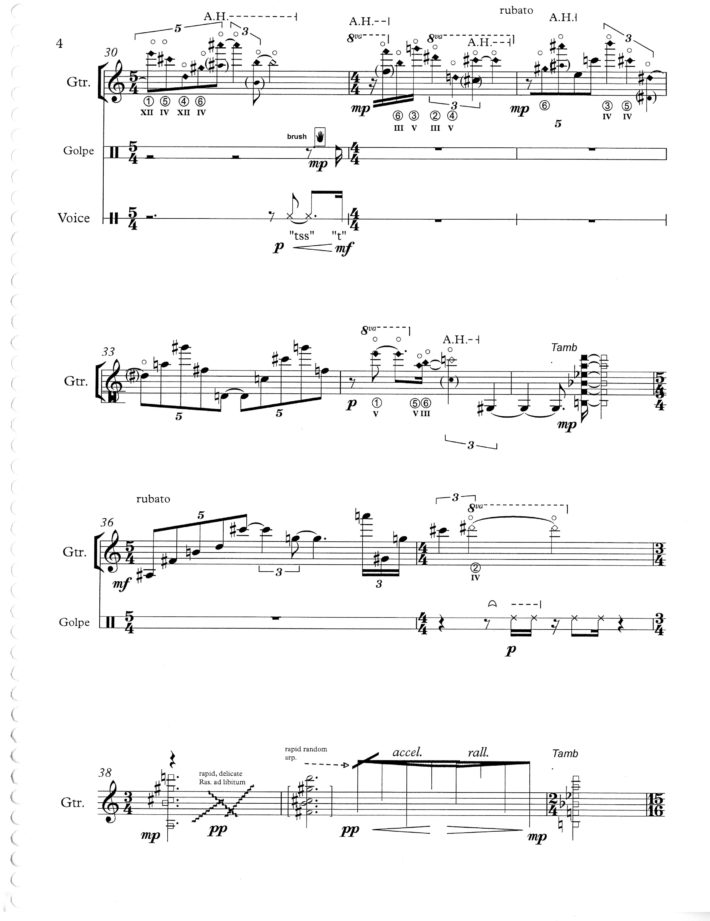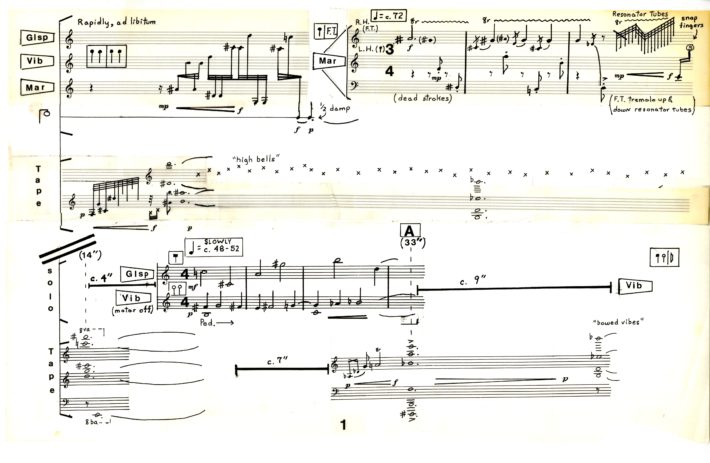 The sextet is a technically demanding piece — a high-water mark in the exploration of simultaneous, asynchronous and “irrational” metrical structures that fascinated me during my early- and mid-twenties. Conceived primarily in terms of rhythmic and textural patterns, the work employed no compositional system other than my ear, and was written in a comparatively brief period of time, despite frequent interruptions. It also was composed during a tumultuous period in my life when I was living at the edge as an anti-war draft resister at the height of the Vietnam War.