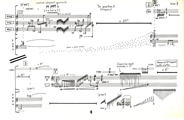 A key tenant of Schindler’s compositional aesthetic, especially in his later electroacoustic works, was what he called “defining sounds”—that is, “pitch or rhythmic motives, sonorities, or chords that are associated with a unique or particular timbre and that recur prominently in varied form and different contexts during a work.” His solo for percussionist John Beck, At the Edge (1989), for example, grew out of two such musical ideas, the first being a rhythmically explosive figure inspired by Professor Beck’s highly charged and meticulous performance style, which the composer juxtaposed against a more distant, chorale like phrase.