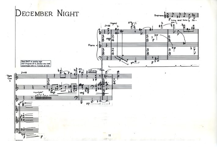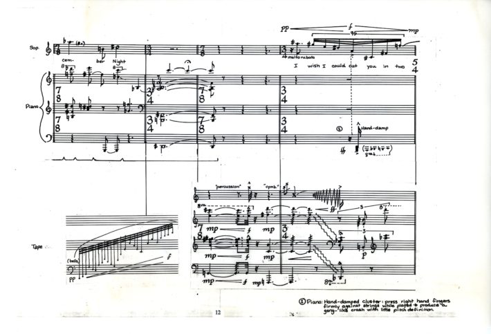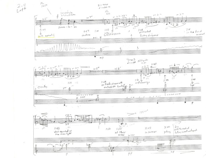 The soprano melodies are technically demanding, incorporating wide melodic leaps and an extended pitch compass, but at the same time often requiring an “effortless” lyricism. The piano part and the computer generated and processed sounds comprise a double, or mirror-like, accompaniment. Prominent melodic, harmonic and rhythmic ideas from the vocal and piano parts are frequently developed in more abstract fashion within the computer textures.[4]