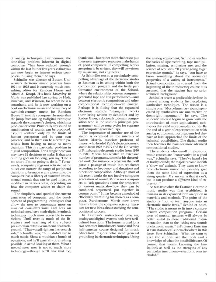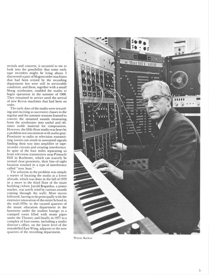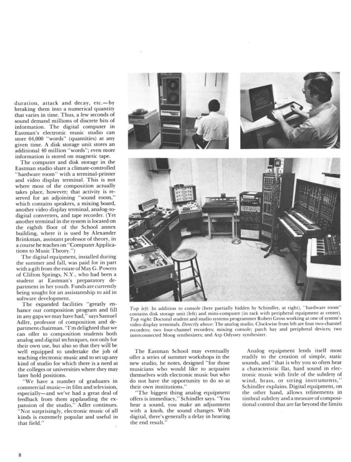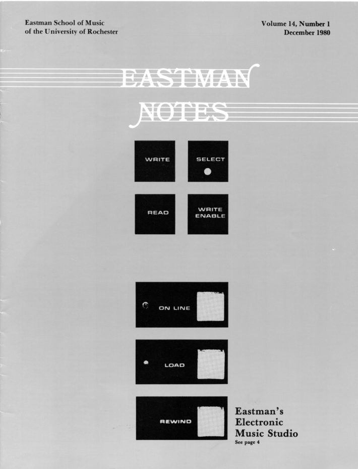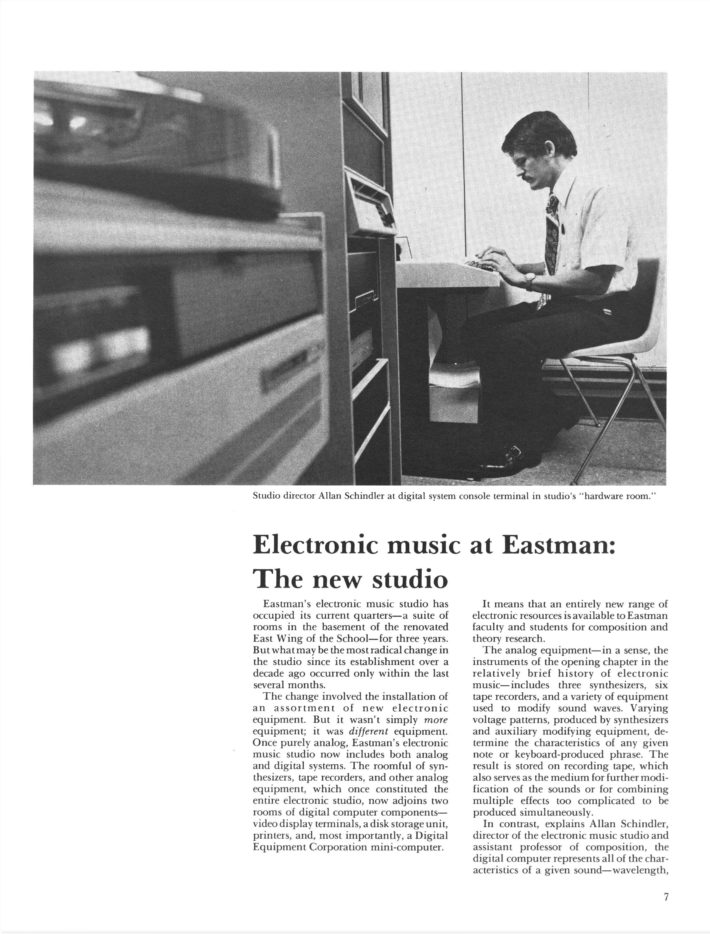 In 1978, Schindler accepted a position at the Eastman School of Music as a Professor of Composition with the special directive to update and expand the school’s Electronic Music Studio. The studio had been founded in 1967 by Wayne Barlow, an Eastman alum (BM 1934, MM 1935, PhD 1937) and longtime Professor of Composition (1937–1978), after intensive research into successful electronic music programs at prominent universities in Europe and Canada. (Barlow’s article “Electronic music at Eastman: A brief history” from Eastman Notes, shown above, provides a detailed history of the studio’s founding and development.) By the time Prof. Barlow retired in 1978, given the emergence of digital audio, Eastman’s Electronic Music Studio was already falling out of date. An increasing number of composers and musicians had begun utilizing computer programming techniques to manipulate digital sound and exert increased creative control over their music. Schindler led the initiative to redesign the studio with a PDP-11/34 “mini-computer” (which, as Schindler notes, was “the size and weight of a good sized refrigerator”) and other necessary hardware for working with digital audio. By December 1980, the new studio—later renamed the Eastman Computer Music Studio (ECMS)—had been installed in a basement suite in Eastman’s newly renovated East Wing. A cover story on the installation of the new studio in Eastman Notes featured photographs of Schindler and Robert Gross, a graduate student in Eastman’s Composition Department and member of the ECMC staff, working in the new studio.