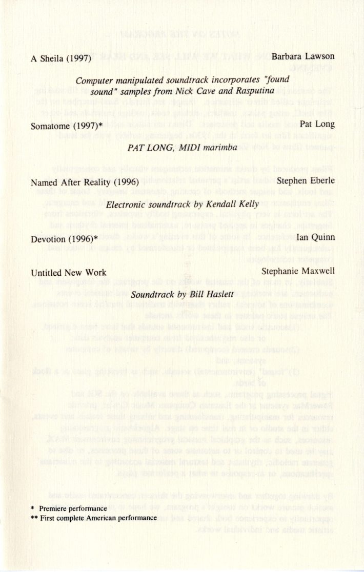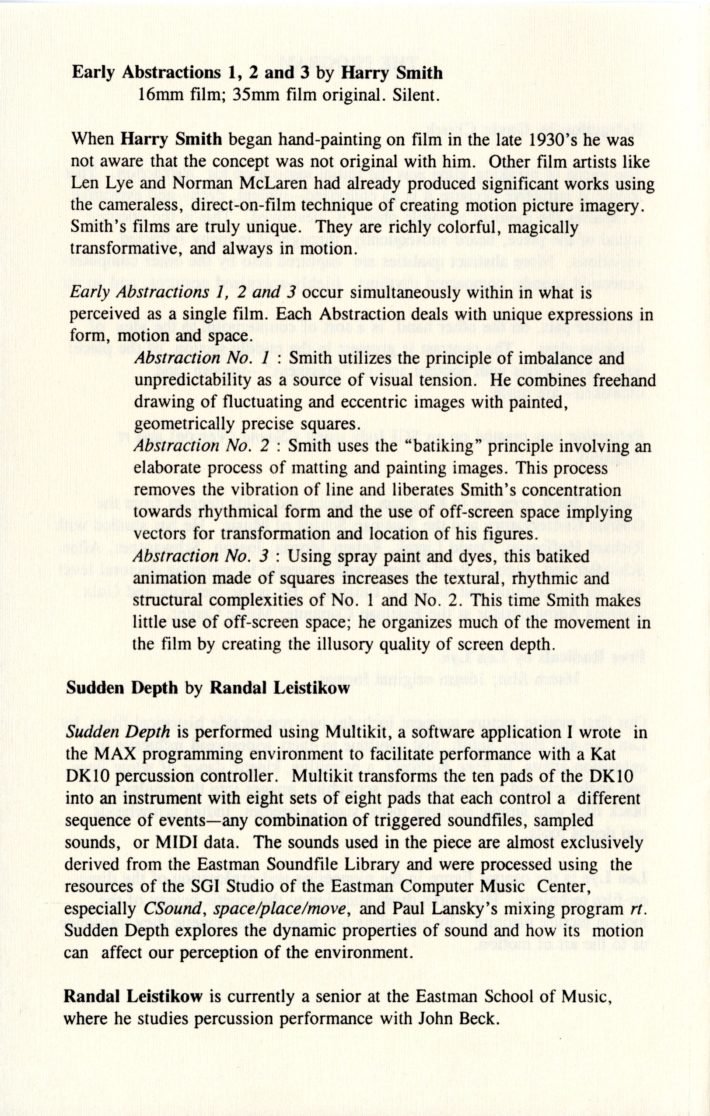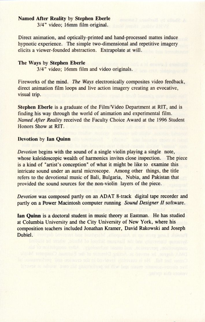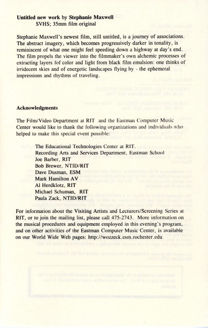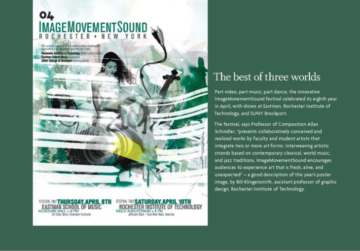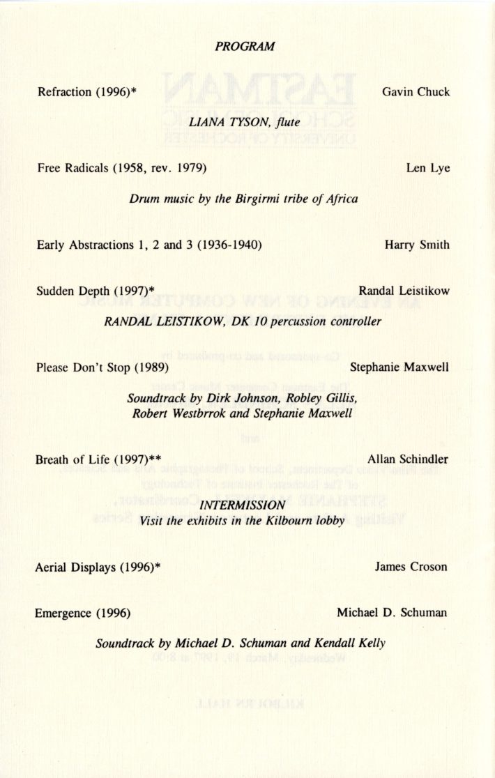 In March 1997, Schindler and the ECMC, working with Stephanie Maxwell, an independent filmmaker and Associate Professor in the Rochester Institute of Technology’s Film/Video Department, organized “An Evening of New Computer Music and Experimental Films” as a showcase for new and innovative works by students and faculty from both institutions. The collaboration proved to be an incredible success. The next year, with SUNY Brockport joining as a third institutional co-sponsor, the event was relaunched as ImageMovementSound, an annual festival of multimedia collaborative works by students and faculty from the participating institutions. Over the festival’s twelve years (1997–2008), teams of filmmakers, graphic and media artists, musicians, composers, choreographers, dancers, and artists from other disciplines conceived and realized more than 100 innovative creations that integrated multiple art forms, many of which went on to win awards at international festivals and competitions. The works often integrated experimental performance and production techniques from each discipline as the teams of creators explored the technical and aesthetic possibilities of their individual and combined artistic media.