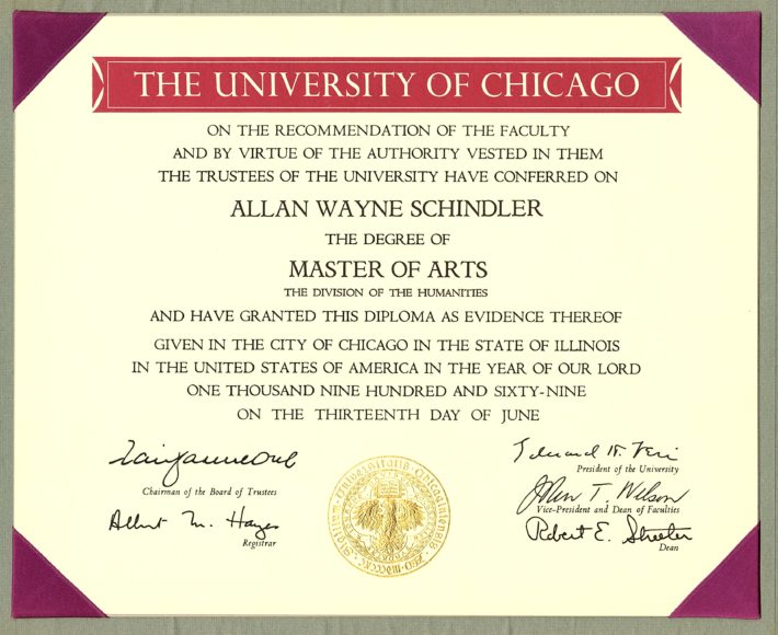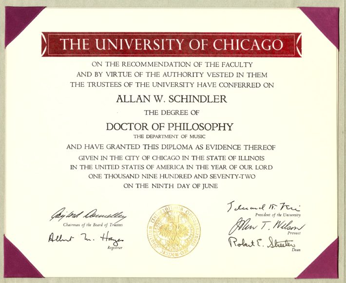 After earning dual bachelor’s degrees from Oberlin College—namely, a Bachelor of Music in Music Composition and a Bachelor of Arts in English Literature (1967)—Schindler pursued graduate studies at the University of Chicago, completing a Master of Arts (1969) and Doctorate of Philosophy in Music Composition (1971) with additional studies in musicology. For his master’s thesis, Schindler composed a technically demanding String Sextet (1969), which he dedicated to his teacher and mentor Ralph Shapey. (Schindler later described Shapey as “the finest, most uncompromising [if also the most difficult] teacher I have ever known.”[1])