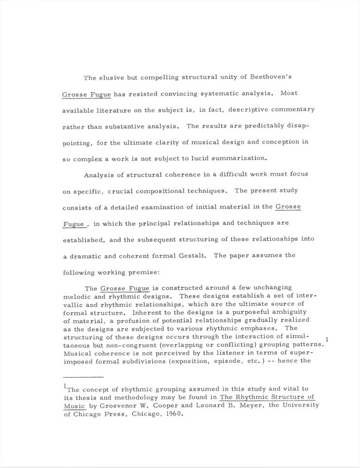 Through his graduate studies at the University of Chicago, Schindler also built a strong foundation in analytical research and scholarship. The Allan Schindler Collection preserves his March 1972 paper “Clarity and Ambiguity in Beethoven’s Grosse Fugue: A Study of Melodic and Rhythmic Design,” which Schindler submitted to the Department of Music as part of in candidacy for his PhD. The paper is a model of his clear writing, eloquent phrasing, and astute analysis, qualities Schindler would apply throughout his career in composer’s and program notes for his compositions, scholarly articles and reviews, textbooks and reference materials, and other publications as well as in his work as a consulting editor for several publishers.