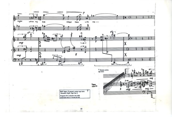 Palmer also praised Schindler’s own contribution—a set of five songs for lyric soprano, piano, and computer-generated sounds titled Spring Winds, Autumn Gusts (1983). In his program notes for the piece, Schindler explained his vision for the song cycle and described its primary musical features: