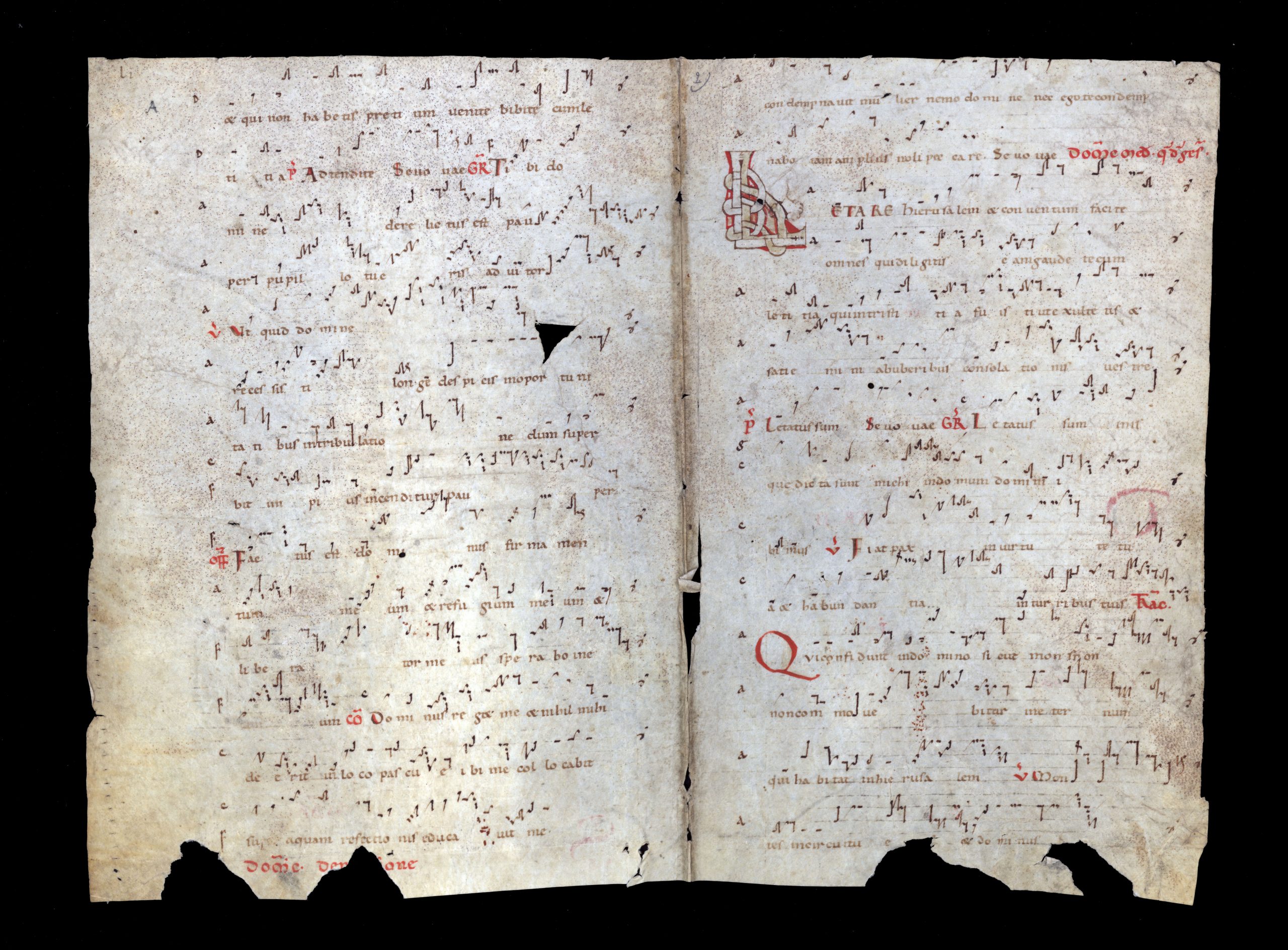 Excellent diastematic Beneventan neumes on 3-line drypoint staff with F or C line marked as appropriate. Text hand displays strong affinity with Carolingian tradition and proto-Gothic.