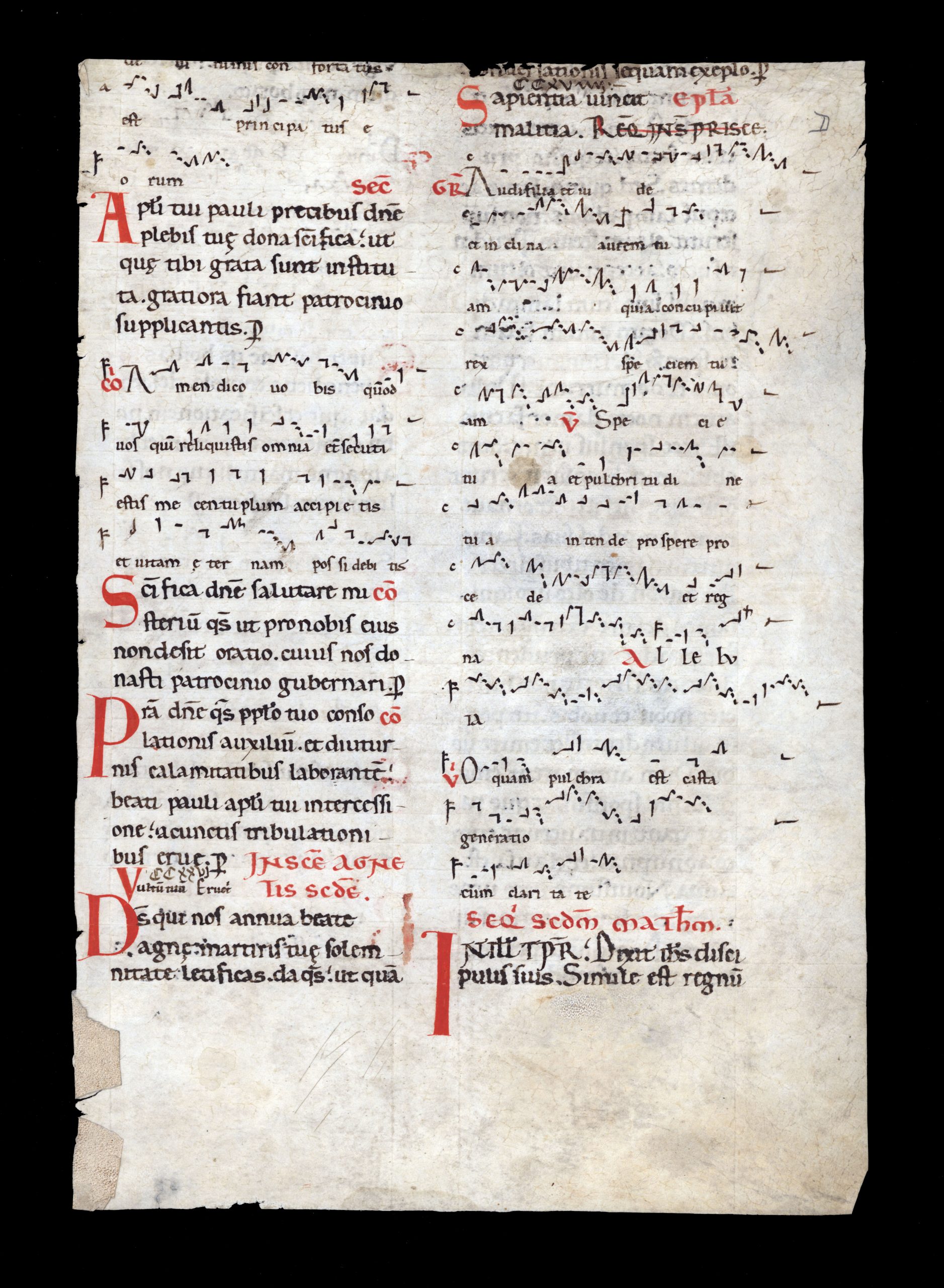 Excellent Beneventan neumes, heightened on 3 (or 4?) drypoint line staff with C or F line marked as appropriate.