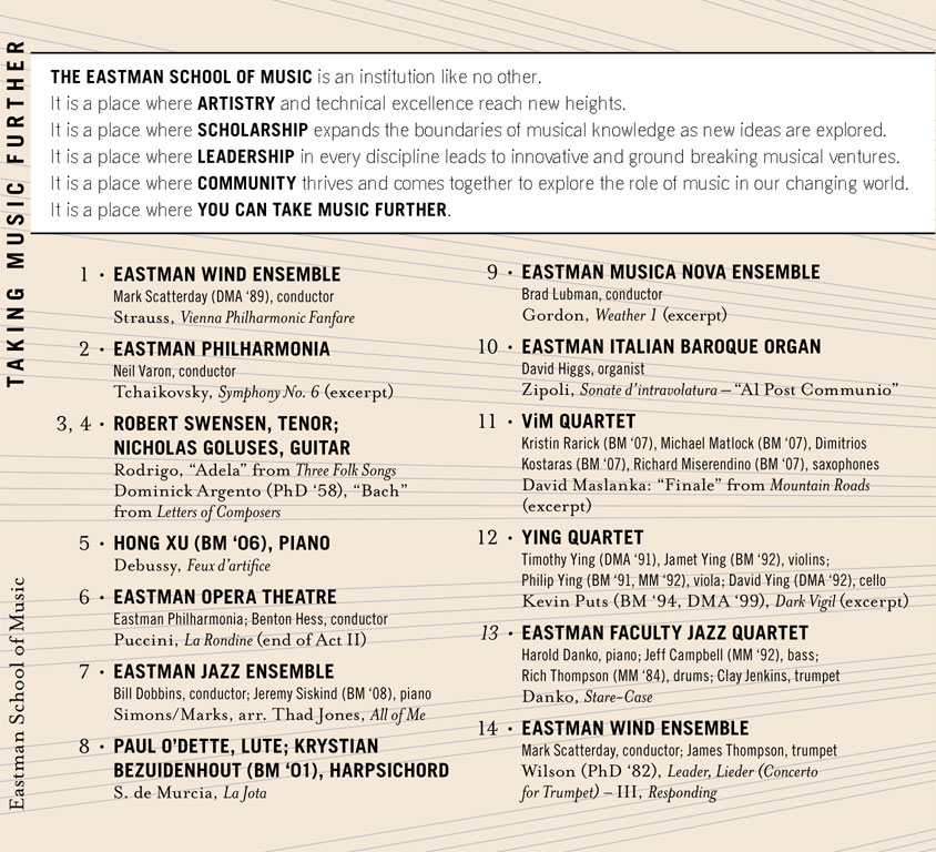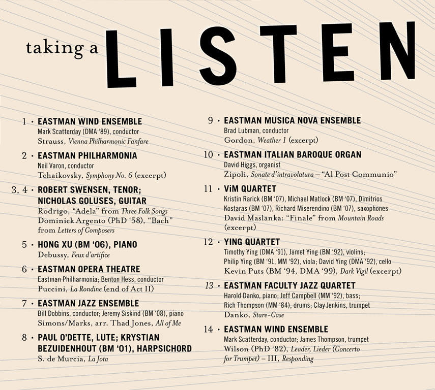 The following tracks feature Eastman’s world-famous faculty artists and world-class students in a wide variety of musical performances: from opera to jazz, from solo performer to full orchestra. Take a listen!
